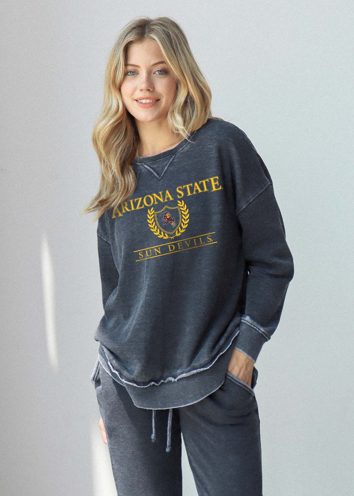 This ultra-soft Arizona State Sun Devils crew neck with dropped shoulders and relaxed hi-lo curved bottom hemline features ribbed neckline, cuffs and hem. Our favorite worn look is achieved by the burnout wash process.
