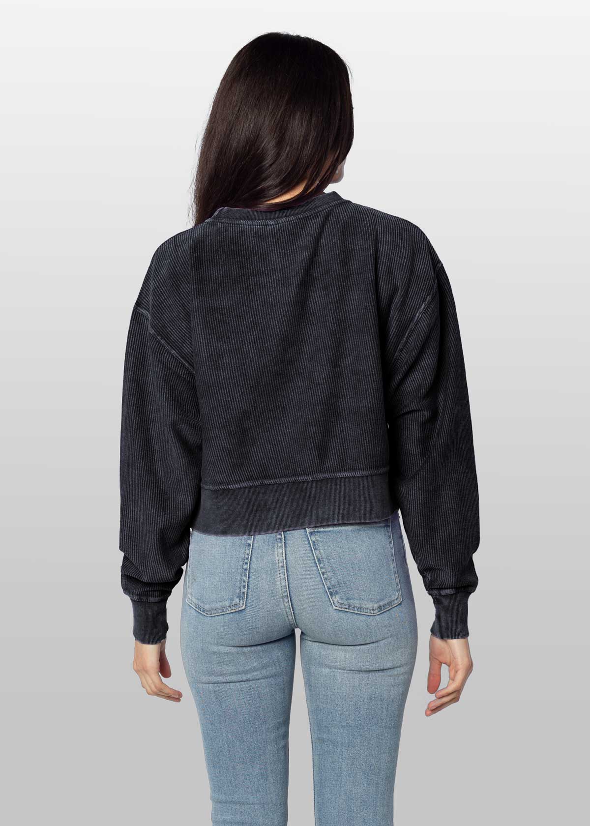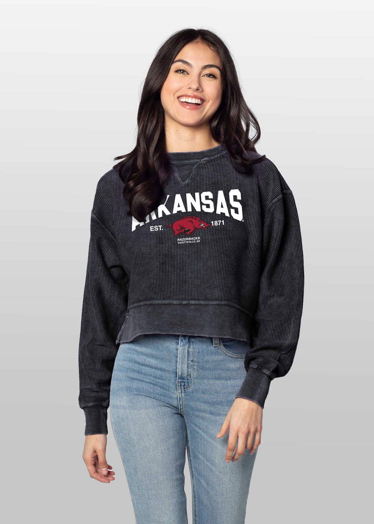 An update to our best seller! Arkansas Razorbacks oversized sweatshirt with a super soft vintage wash corded fabric. Shorter cropped, feminine silhouette features a ribbed neckline, cuff and hemline.