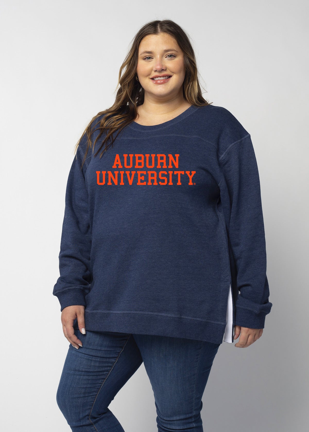 A classic Auburn Tigers crew neck fleece in a flattering tunic length that provides perfect coverage. Made for multitasking, the relaxed silhouette looks good in a variety of settings and pairs well with beloved jeans or leggings for extra comfort. Made from a heathered fleece with an extra smooth finish. Features easy-moving side slits finished with white twill tape