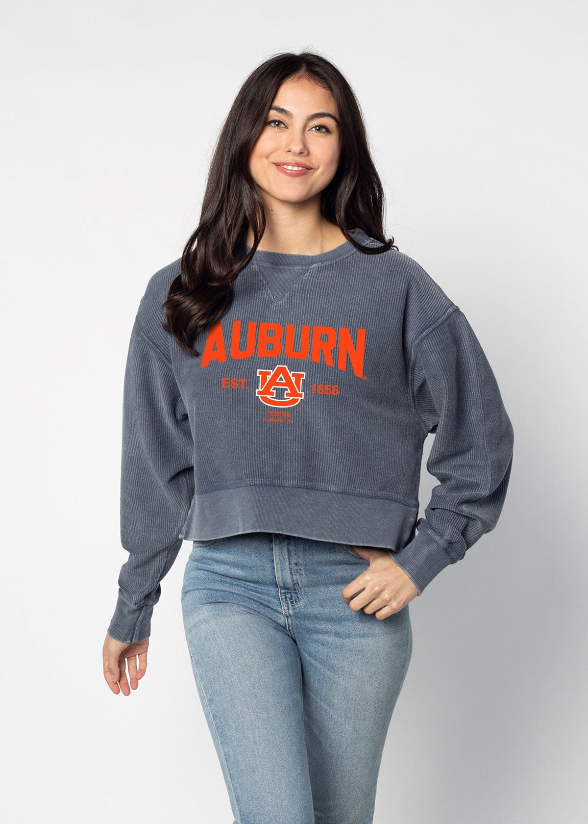 An update to our best seller! Auburn Tigers oversized sweatshirt with a super soft vintage wash corded fabric. Shorter cropped, feminine silhouette features a ribbed neckline, cuff and hemline.