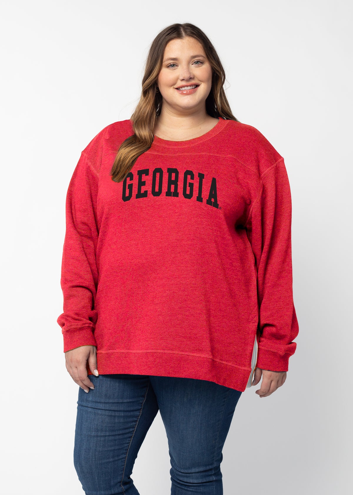 A classic Georgia Bulldogs crew neck fleece in a flattering tunic length that provides perfect coverage. Made for multitasking, the relaxed silhouette looks good in a variety of settings and pairs well with beloved jeans or leggings for extra comfort. Made from a heathered fleece with an extra smooth finish. Features easy-moving side slits finished with white twill tape