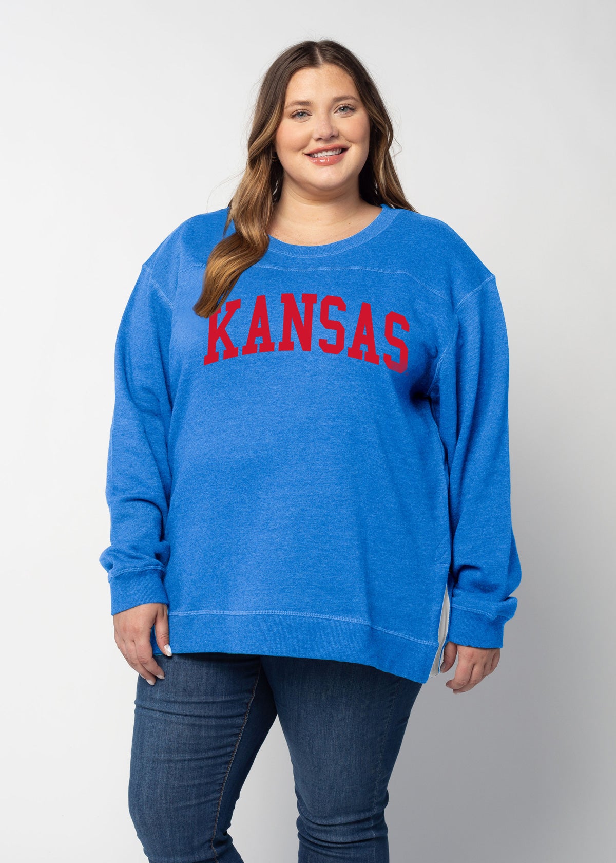 A classic Kansas Jayhawks crew neck fleece in a flattering tunic length that provides perfect coverage. Made for multitasking, the relaxed silhouette looks good in a variety of settings and pairs well with beloved jeans or leggings for extra comfort. Made from a heathered fleece with an extra smooth finish. Features easy-moving side slits finished with white twill tape