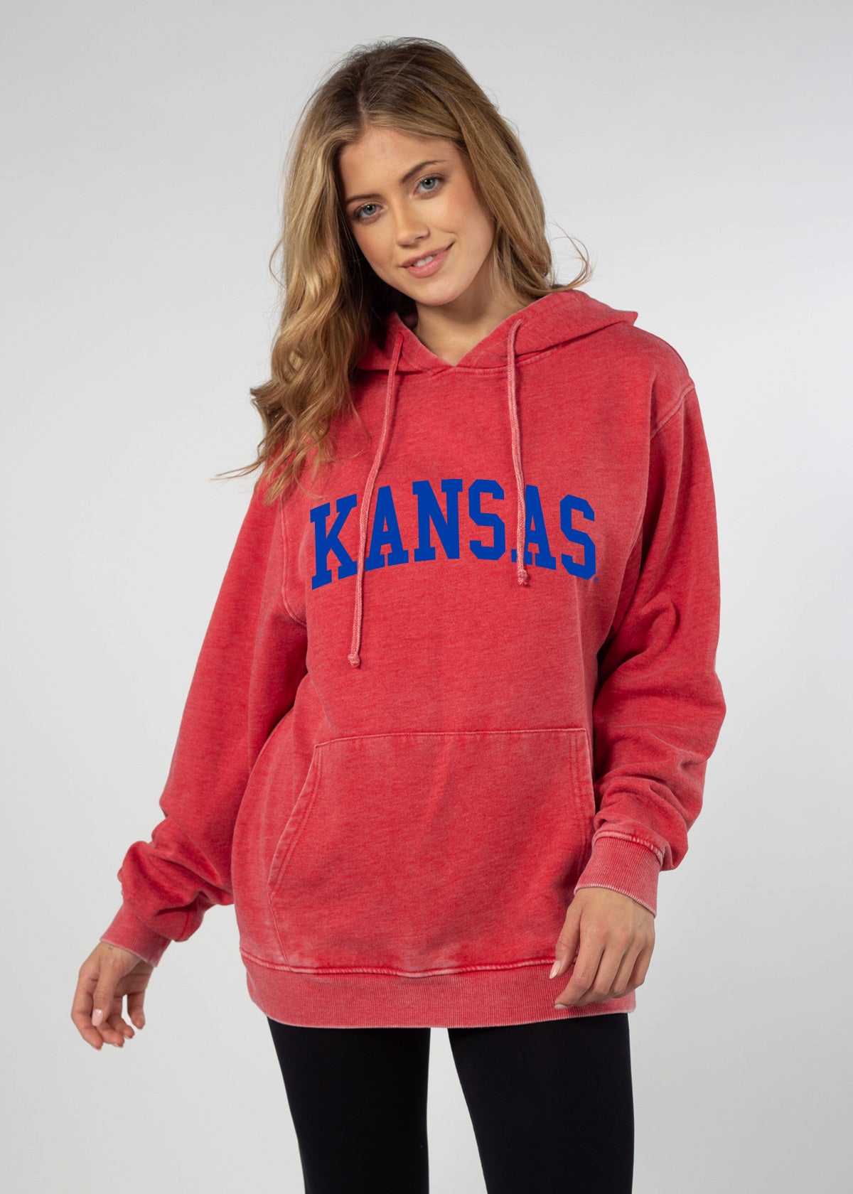 Unisex Kansas Jayhawks fleece hoodie with kangaroo front pocket. Ribbed cuffs and hem. Dropped shoulders and relaxed bottom hemline. Burnout wash process provides a unique, washed and worn look and a comfortable feel.