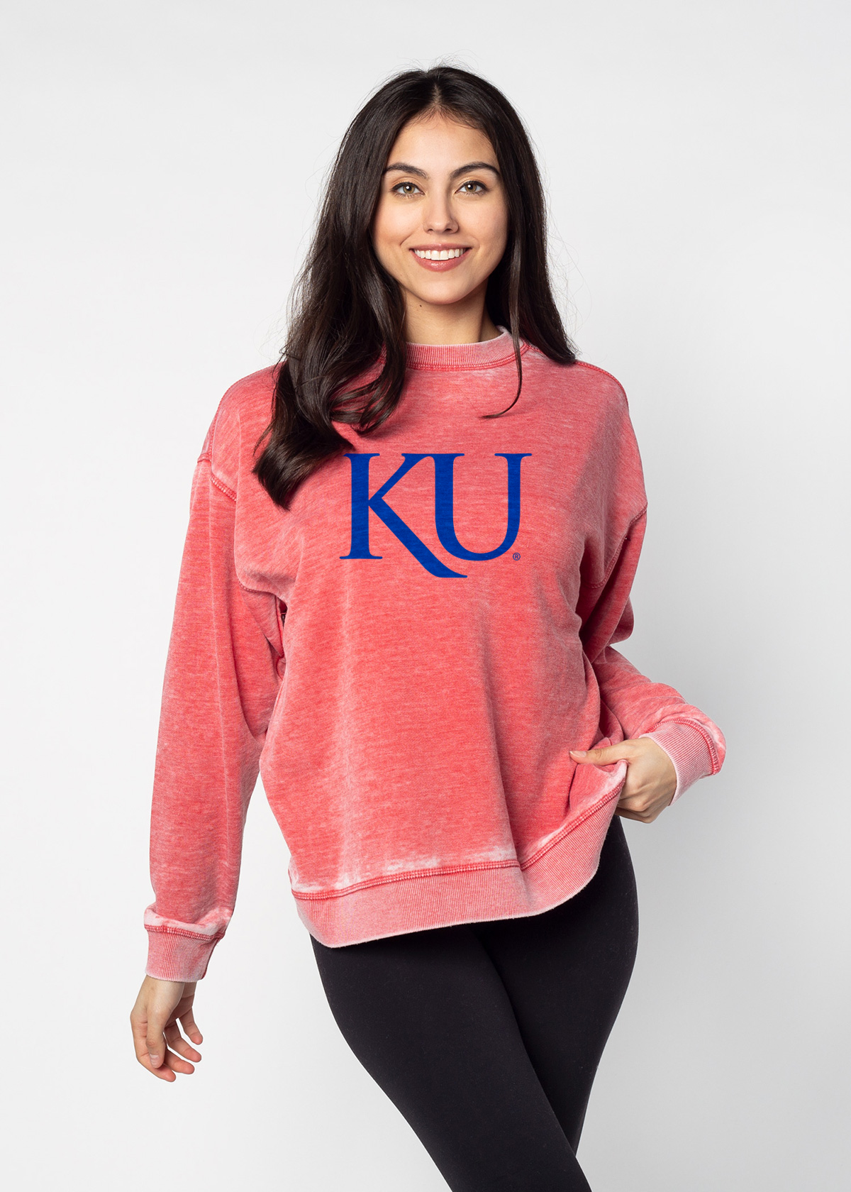 The softest, coziest Kansas Jayhawks fleece you'll ever wear. Buttery soft to the touch and burnout wash treatment for an edgy take on this classic silhouette. Unisex oversized fleece sweatshirt with ribbed neckline, cuffs, hem. Dropped shoulders and relaxed bottom hemline.