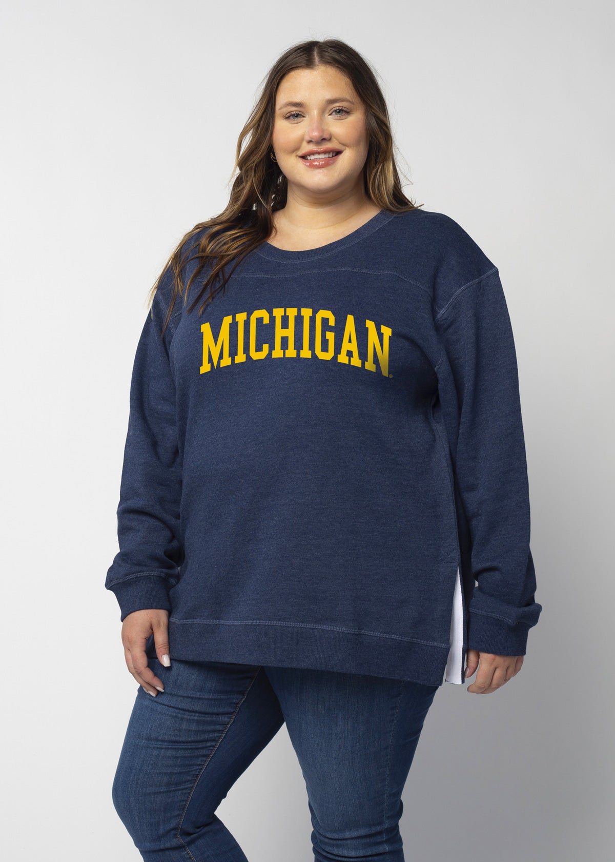 A classic Michigan Wolverines crew neck fleece in a flattering tunic length that provides perfect coverage. Made for multitasking, the relaxed silhouette looks good in a variety of settings and pairs well with beloved jeans or leggings for extra comfort. Made from a heathered fleece with an extra smooth finish. Features easy-moving side slits finished with white twill tape