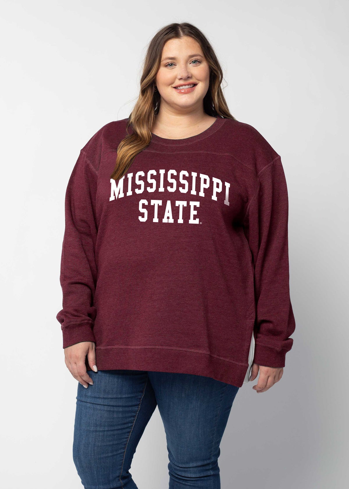 A classic Mississippi State Bulldogs crew neck fleece in a flattering tunic length that provides perfect coverage. Made for multitasking, the relaxed silhouette looks good in a variety of settings and pairs well with beloved jeans or leggings for extra comfort. Made from a heathered fleece with an extra smooth finish. Features easy-moving side slits finished with white twill tape