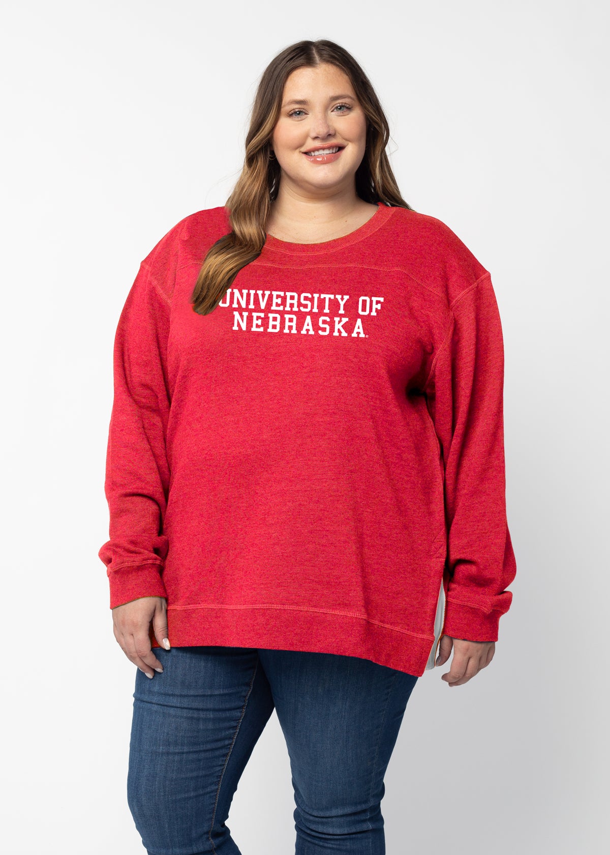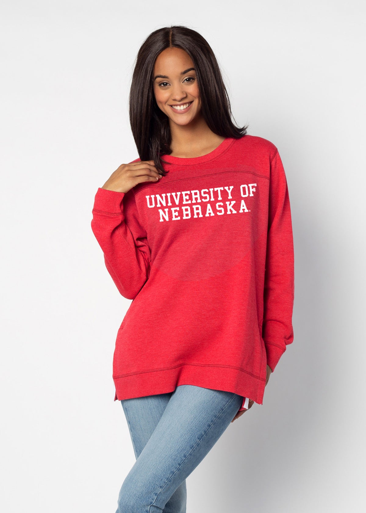 A classic Nebraska Cornhuskers crew neck fleece in a flattering tunic length that provides perfect coverage. Made for multitasking, the relaxed silhouette looks good in a variety of settings and pairs well with beloved jeans or leggings for extra comfort. Made from a heathered fleece with an extra smooth finish. Features easy-moving side slits finished with white twill tape