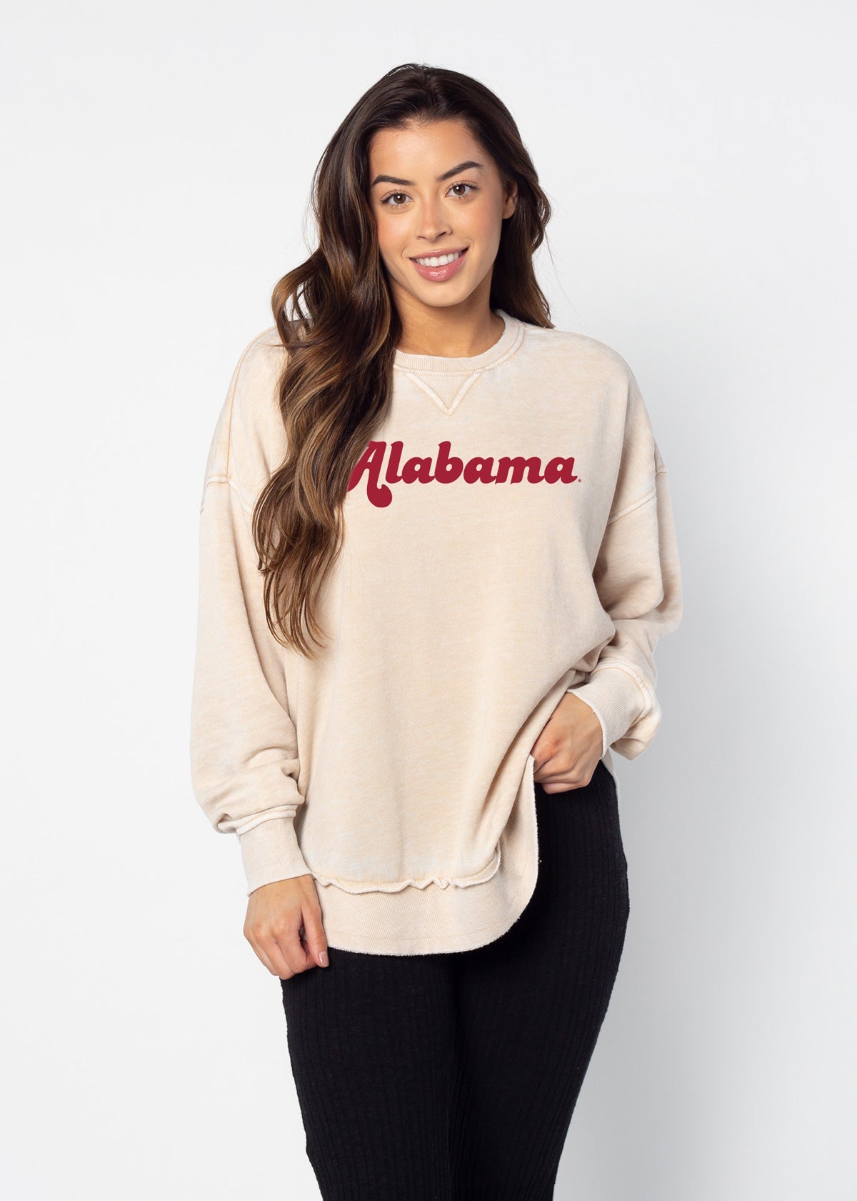 This ultra-soft Alabama Crimson Tide crew neck with dropped shoulders and relaxed hi-lo curved bottom hemline features ribbed neckline, cuffs and hem. Our favorite worn look is achieved by the burnout wash process.