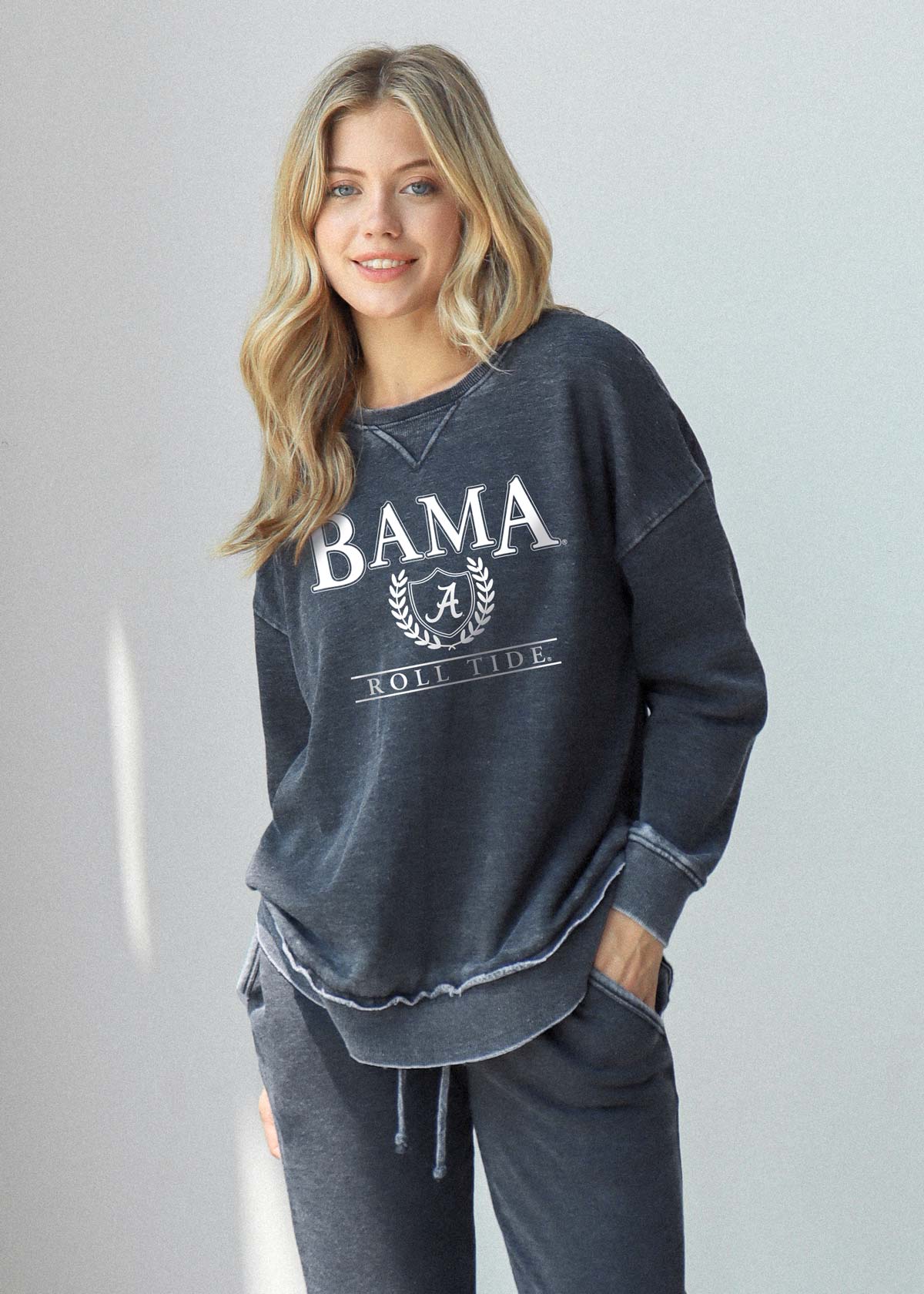 This ultra-soft Alabama Crimson Tide crew neck with dropped shoulders and relaxed hi-lo curved bottom hemline features ribbed neckline, cuffs and hem. Our favorite worn look is achieved by the burnout wash process.