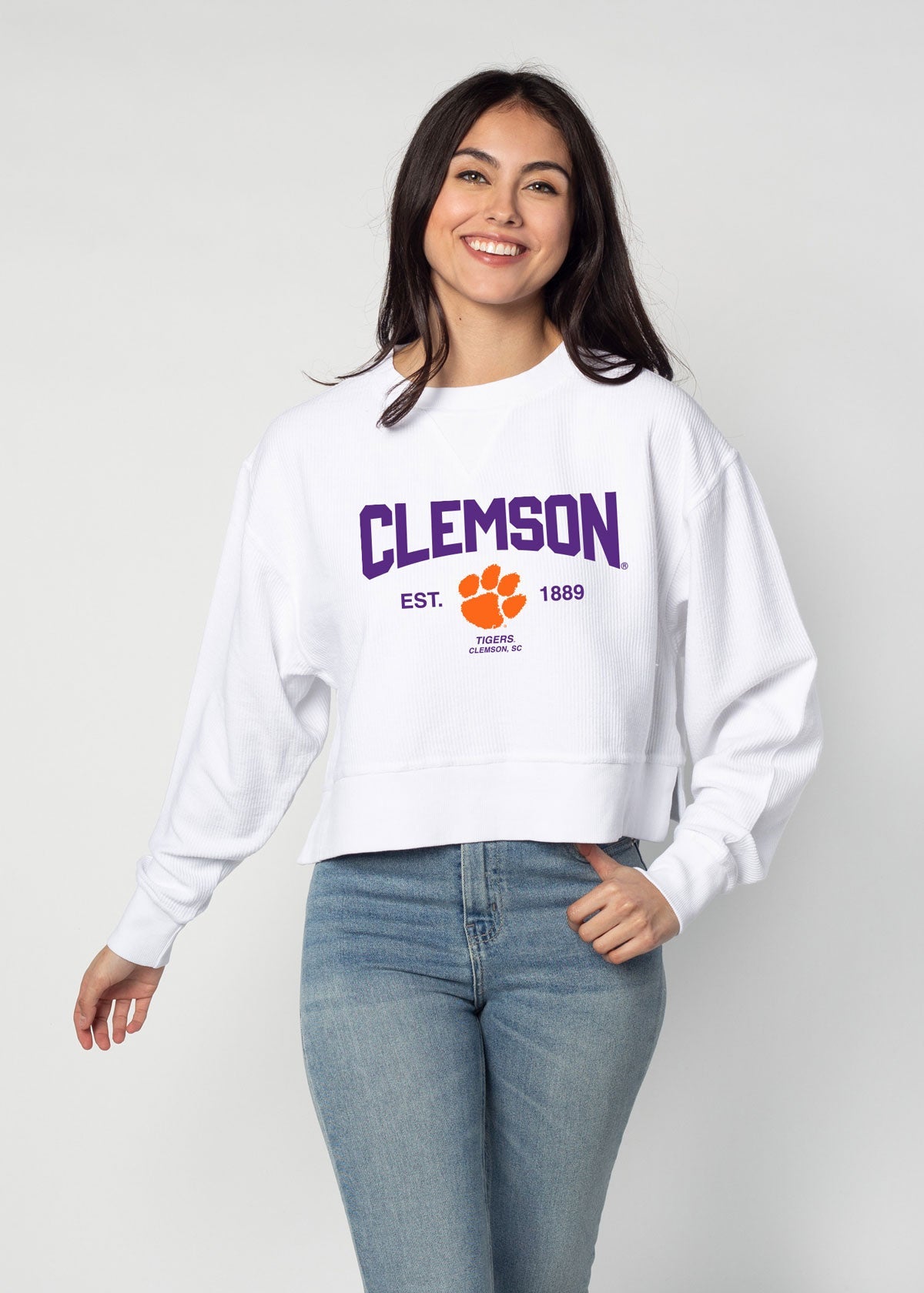 An update to our best seller! Clemson Tigers oversized sweatshirt with a super soft vintage wash corded fabric. Shorter cropped, feminine silhouette features a ribbed neckline, cuff and hemline.
