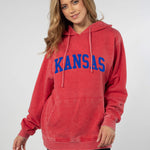 Unisex Kansas Jayhawks fleece hoodie with kangaroo front pocket. Ribbed cuffs and hem. Dropped shoulders and relaxed bottom hemline. Burnout wash process provides a unique, washed and worn look and a comfortable feel.