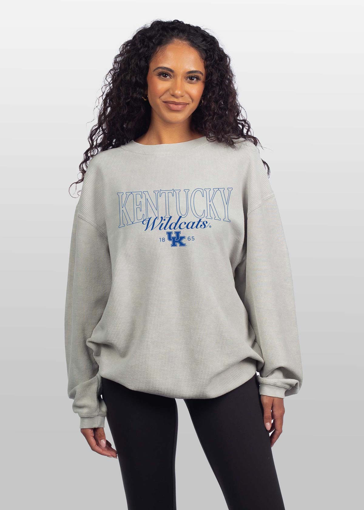 Our best seller! Officially licensed Kentucky Wildcats oversized sweatshirt made with super soft, vintage-washed corded fabric. Features a ribbed crew neckline, cuffs, and hemline. Each piece is individually dyed, so please note there may be variation in color piece to piece. Sometimes, there can be a light streak at the shoulder due to the unique dye process, which is common.