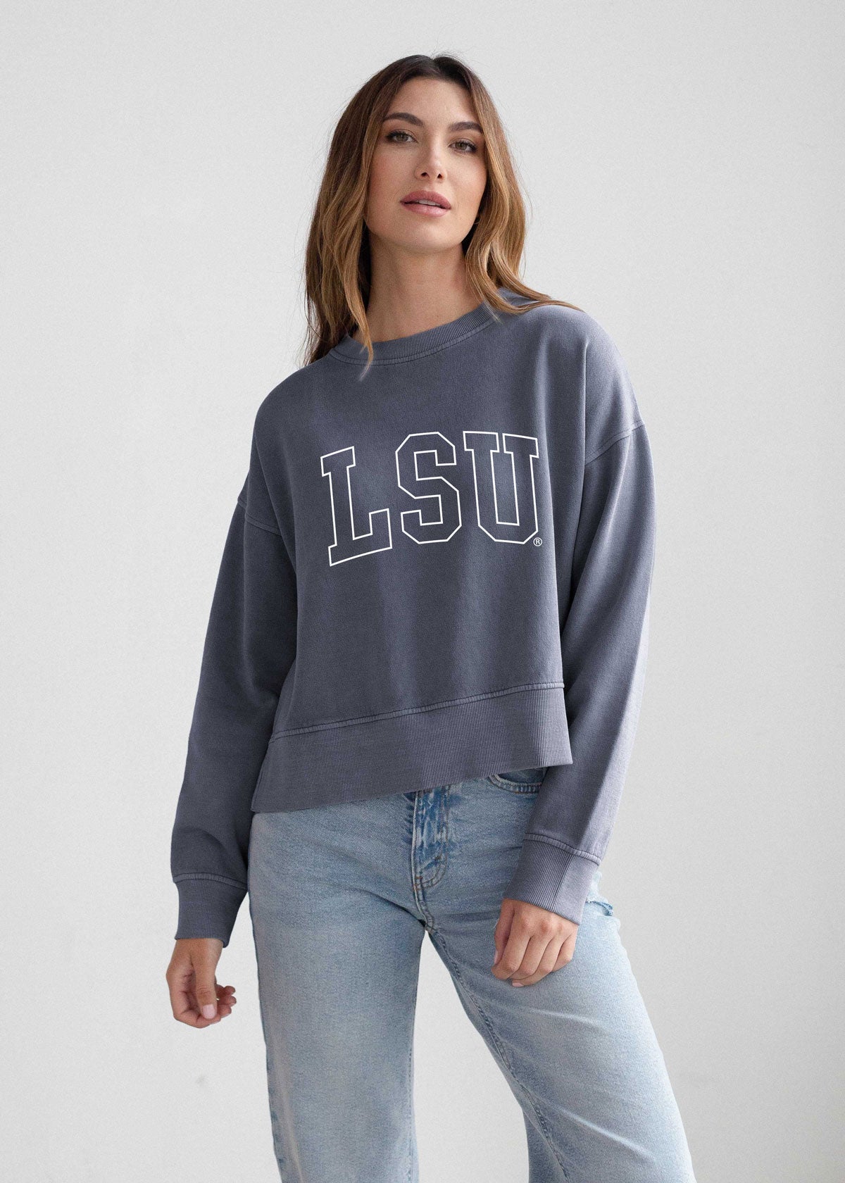 Introducing our LSU Tigers Malibu Crew sweatshirt, crafted from our signature Salt Wash fleece, this pullover is as soft as it gets, offering a luxurious feel against your skin. Designed to elevate your everyday style. Featuring a cropped length and flattering seaming details, along with a classic crew neckline and wide bottom rib band.