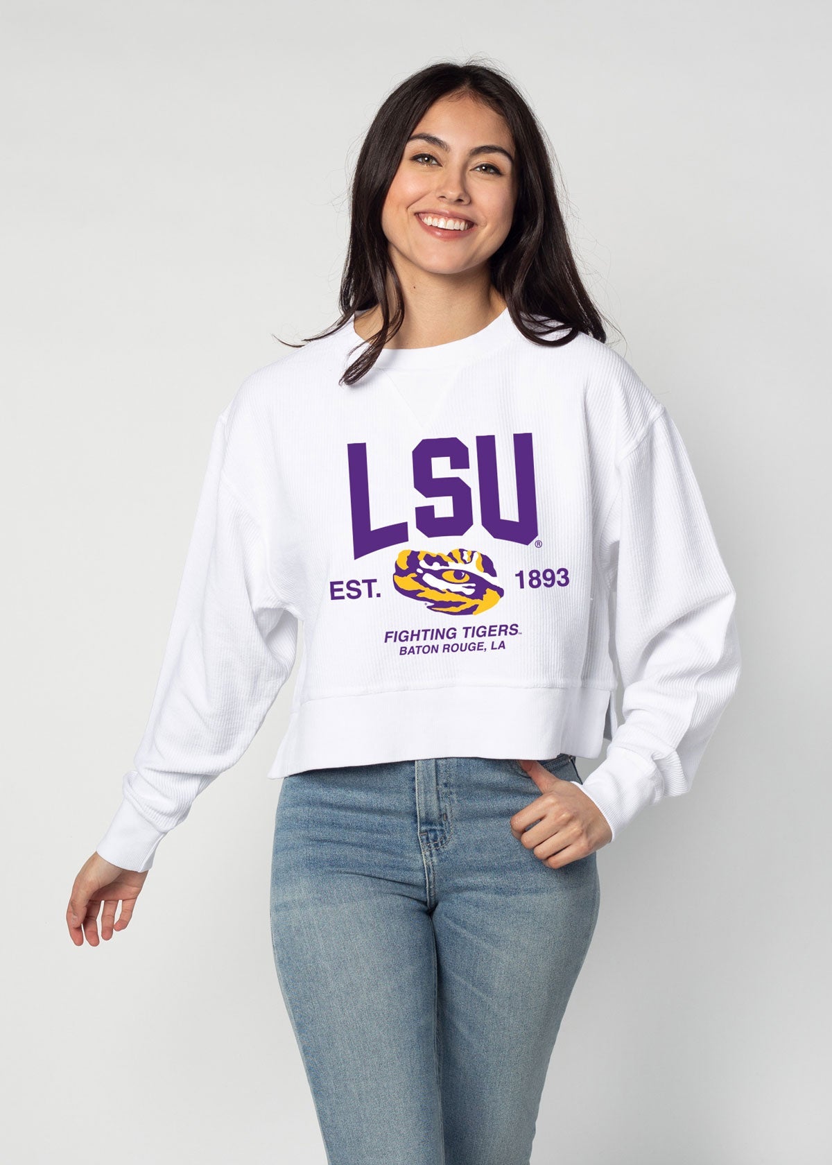 An update to our best seller! LSU Tigers oversized sweatshirt with a super soft vintage wash corded fabric. Shorter cropped, feminine silhouette features a ribbed neckline, cuff and hemline.