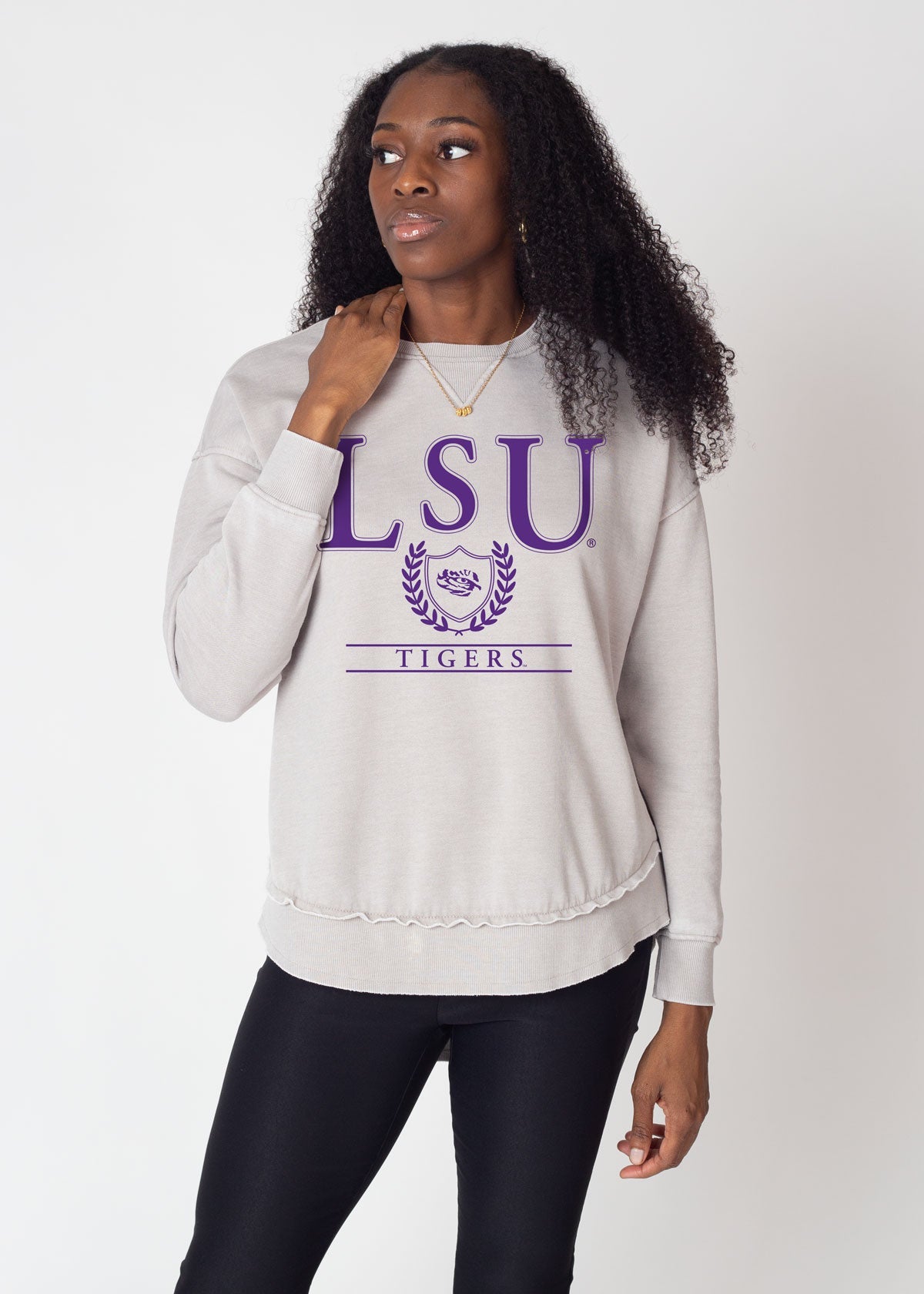 This ultra-soft LSU Tigers crew neck with dropped shoulders and relaxed hi-lo curved bottom hemline features ribbed neckline, cuffs and hem. Our favorite worn look is achieved by the burnout wash process.