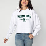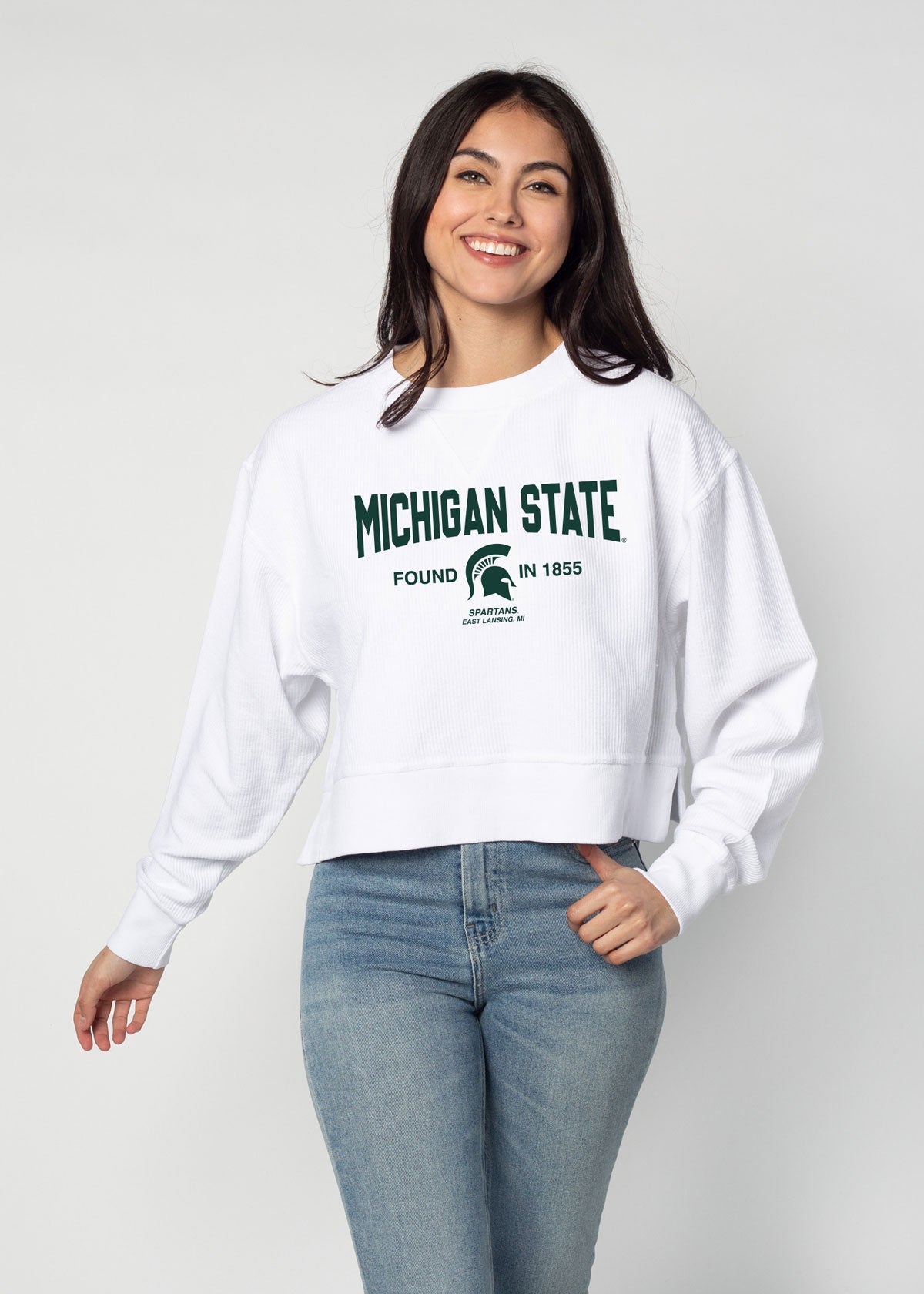 An update to our best seller! Michigan State Spartans oversized sweatshirt with a super soft vintage wash corded fabric. Shorter cropped, feminine silhouette features a ribbed neckline, cuff and hemline.