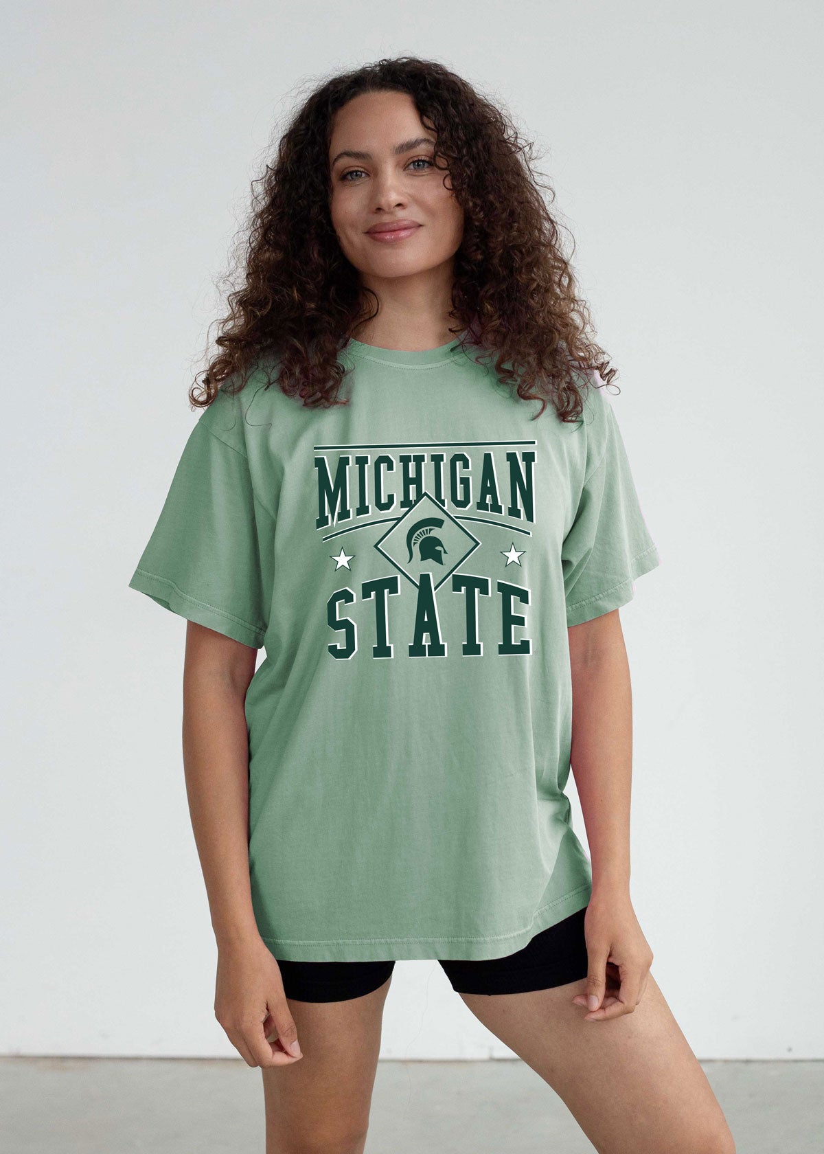 Say hello to effortless relaxation and embrace the laid-back vibes with the Michigan State Spartans OBX Short Sleeve T-shirt. Crafted with a super soft cotton jersey, and finished with a salt wash for a worn out look. With its classic crew neck, relaxed dropped shoulders, and spacious short sleeves, it offers both comfort and style in equal measure.