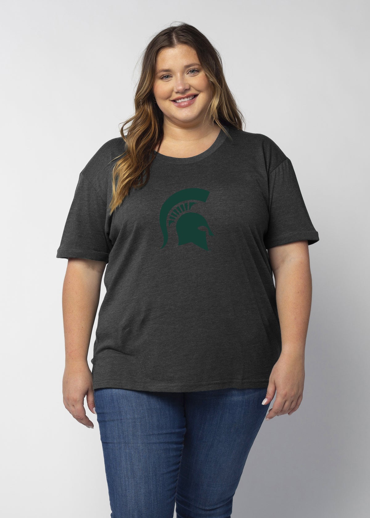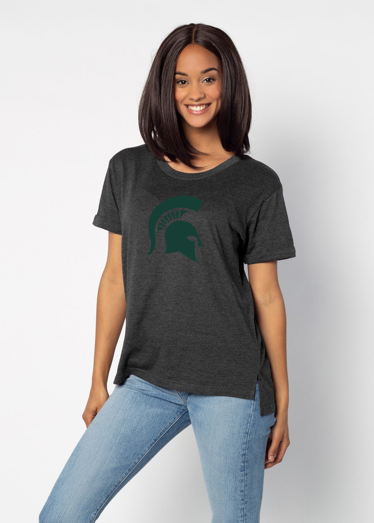 A Michigan State Spartans staple with just the right amount of detail. This easygoing everyday tee is crafted from a lightweight cotton poly blend with a subtle heathered look and a soft hand feel. Features ribbed scoop neck, short rolled sleeves, and a longer back hem for extra coverage.