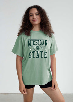 The softest, coziest fleece you'll ever wear — now officially licensed for the Michigan State Spartans. Buttery soft to the touch, with a burnout wash treatment for an edgy take on this classic silhouette. Unisex oversized fleece sweatshirt with ribbed neckline, cuffs, and hem. Dropped shoulders and a relaxed bottom hemline.