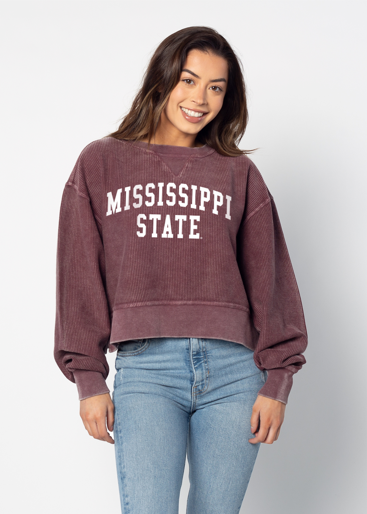 An update to our best seller! Mississippi State Bulldogs oversized sweatshirt with a super soft vintage wash corded fabric. Waist-length, feminine silhouette features a ribbed neckline, cuff and hemline.