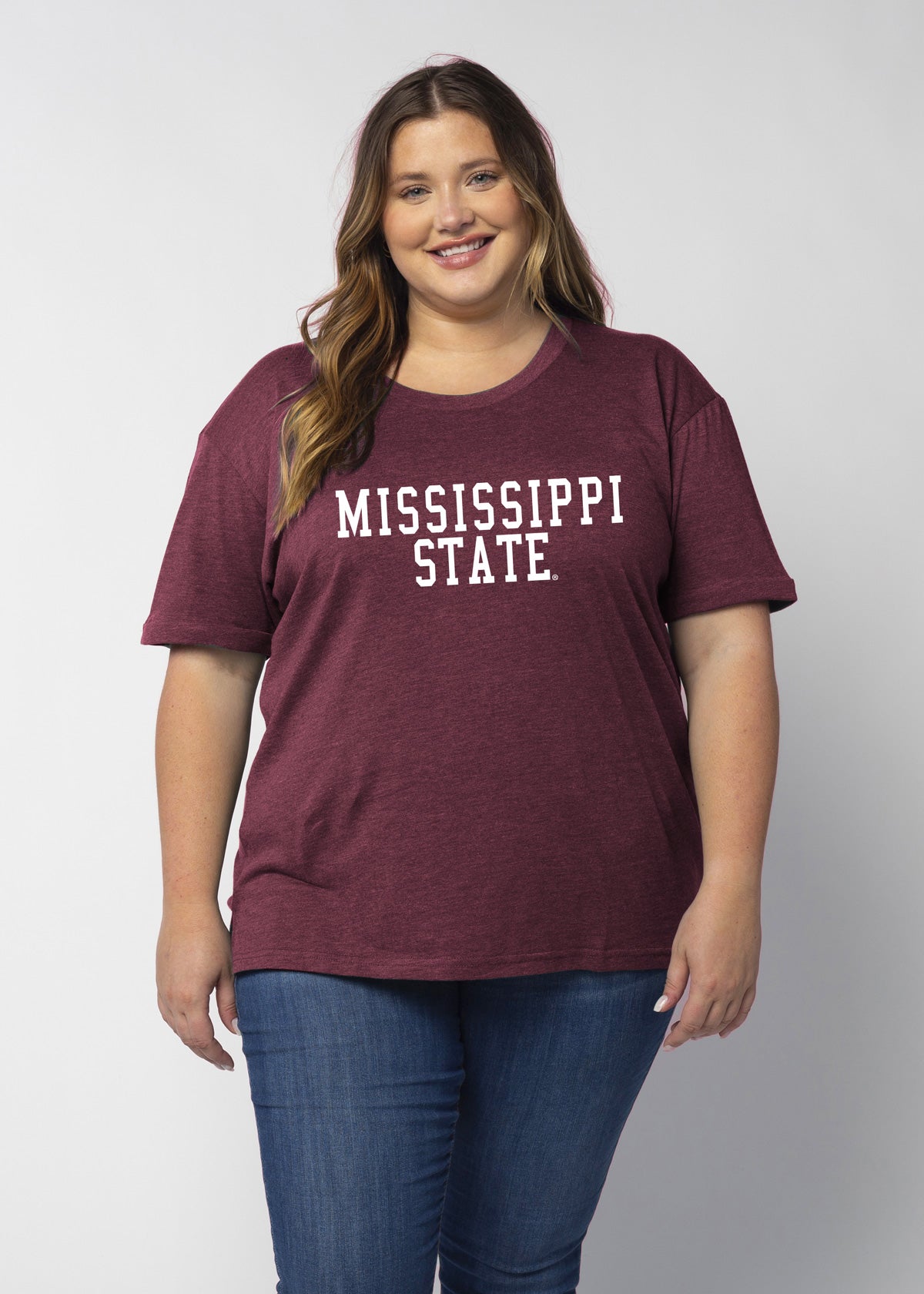 A Mississippi State Bulldogs staple with just the right amount of detail. This easygoing everyday tee is crafted from a lightweight cotton poly blend with a subtle heathered look and a soft hand feel. Features ribbed scoop neck, short rolled sleeves, and a longer back hem for extra coverage.