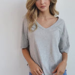Elevate your basics with this short sleeve dolman tee. Made from a breathable cotton poly blend with a subtle heathered look and a soft hand feel. The tee has a semi-rounded v-neckline, dropped shoulders, and a shirttail hem with side slits.