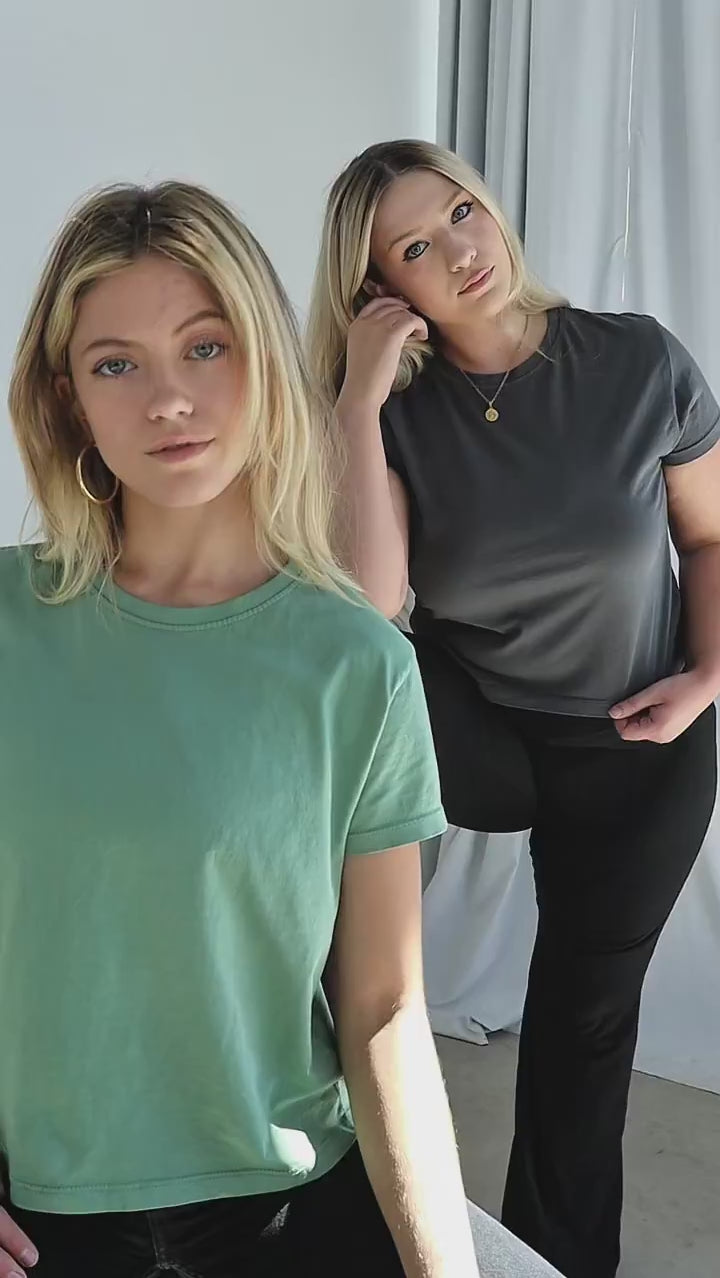 Introducing the ultimate throw-on-and-go cropped tee. This effortless crew neck tee is crafted from ultra-soft, lightweight cotton jersey fabric, and finished with a salt wash for that worn-out appearance. With its crop length hitting just below the waist, it's designed to flatter and elevate any outfit. Say hello to your ticket to paradise with The Montauk Tee.