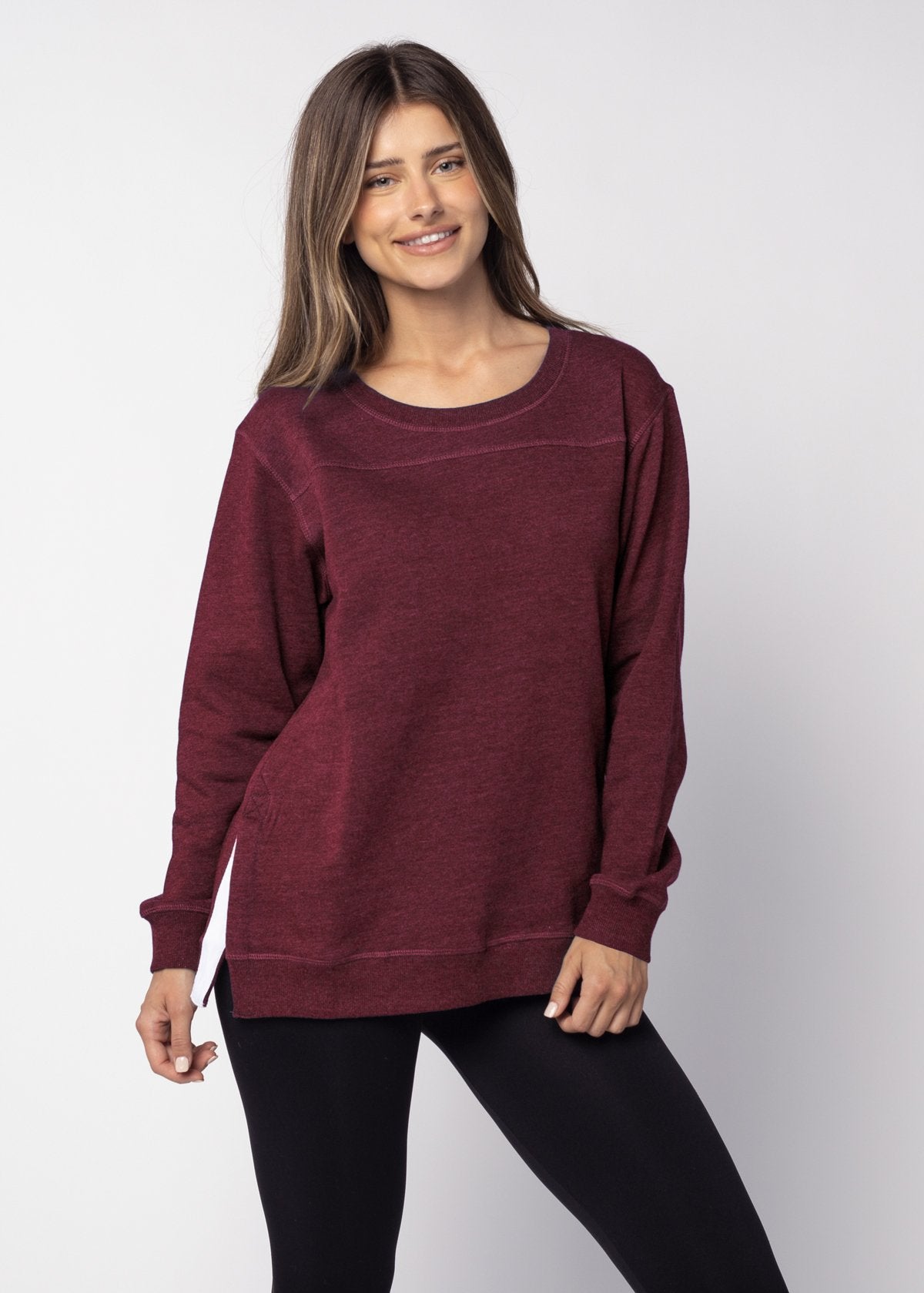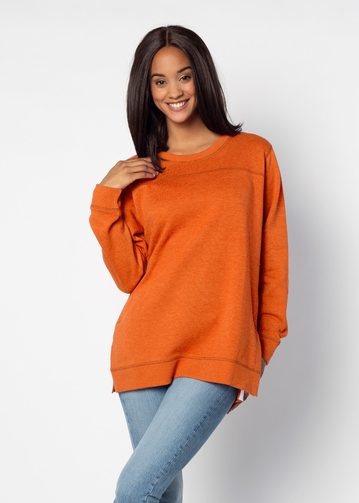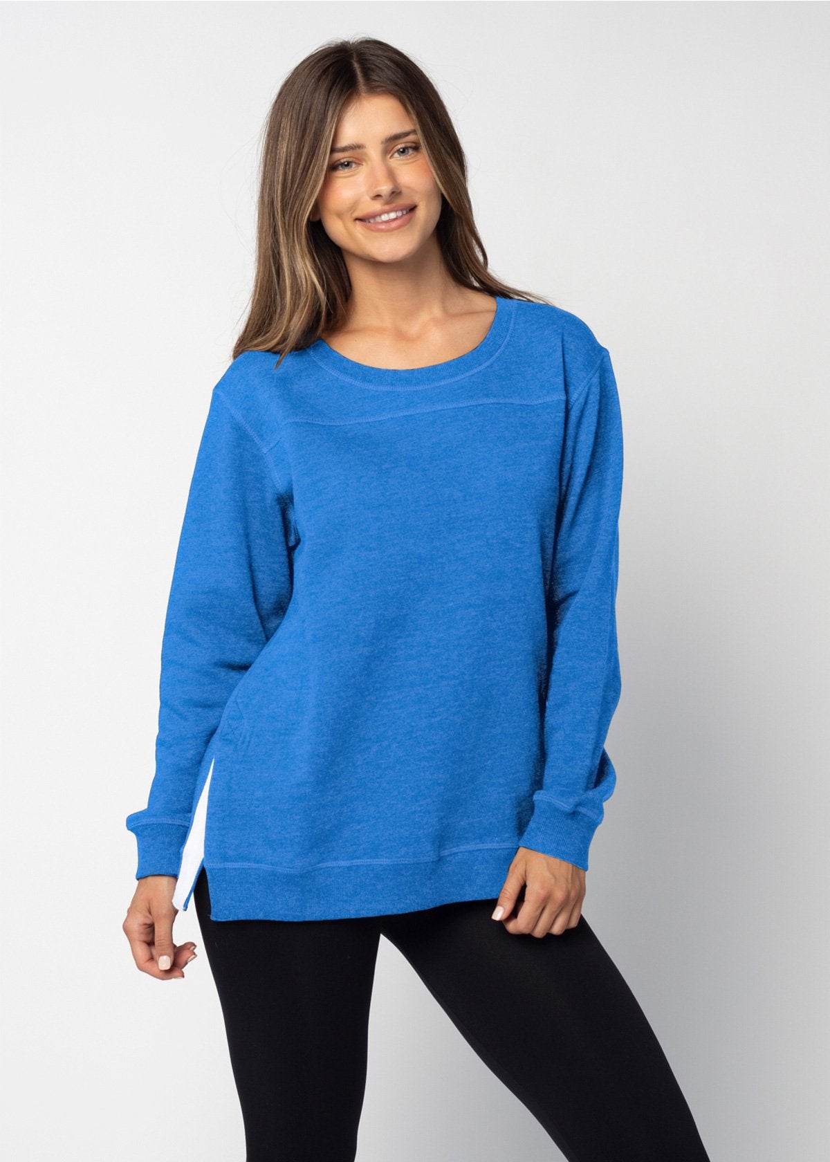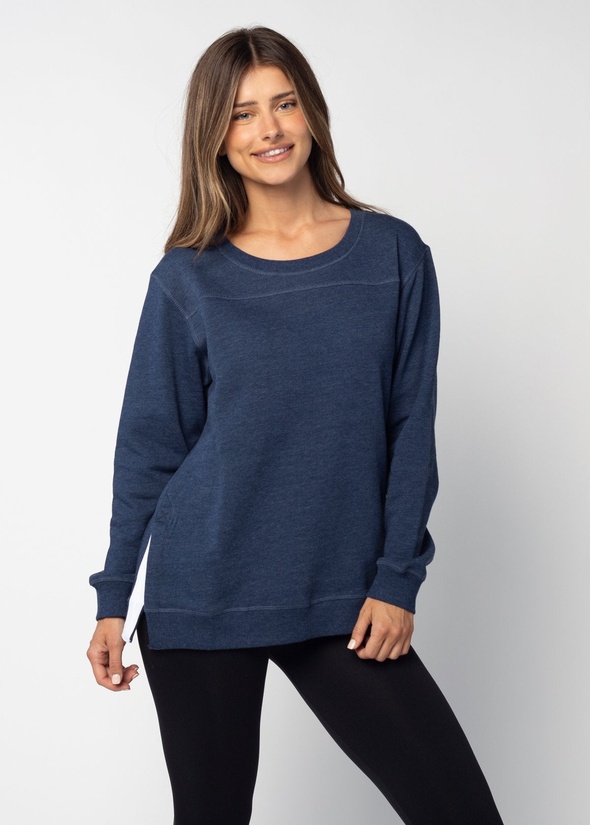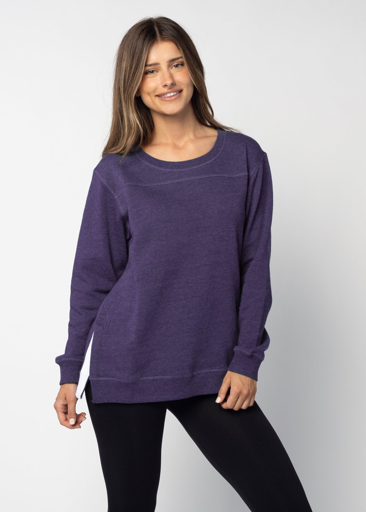 A classic crew neck fleece in a flattering tunic length that provides perfect coverage. Made for multitasking, the relaxed silhouette looks good in a variety of settings and pairs well with beloved jeans or leggings for extra comfort. Made from a heathered fleece with an extra smooth finish. Features easy-moving side slits finished with white twill tape