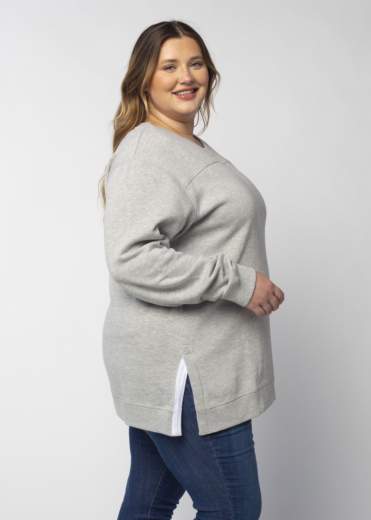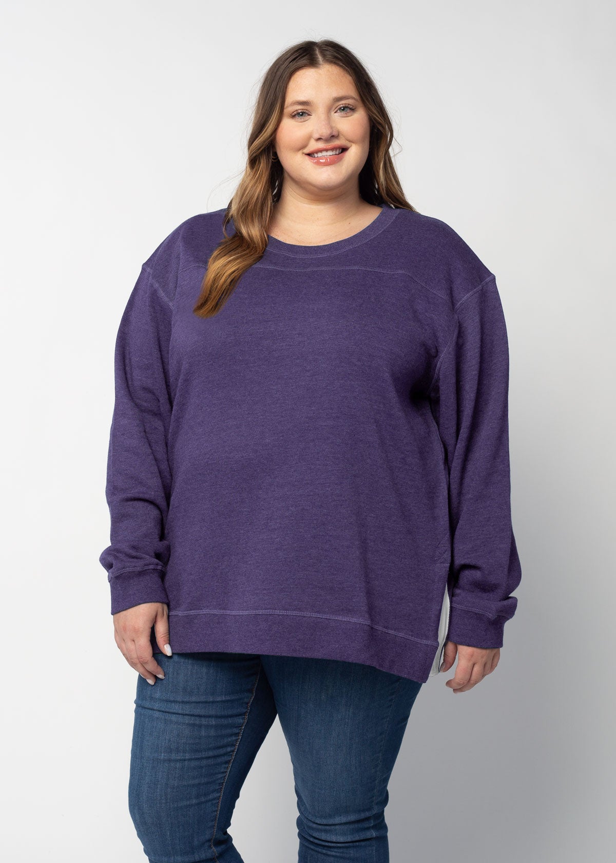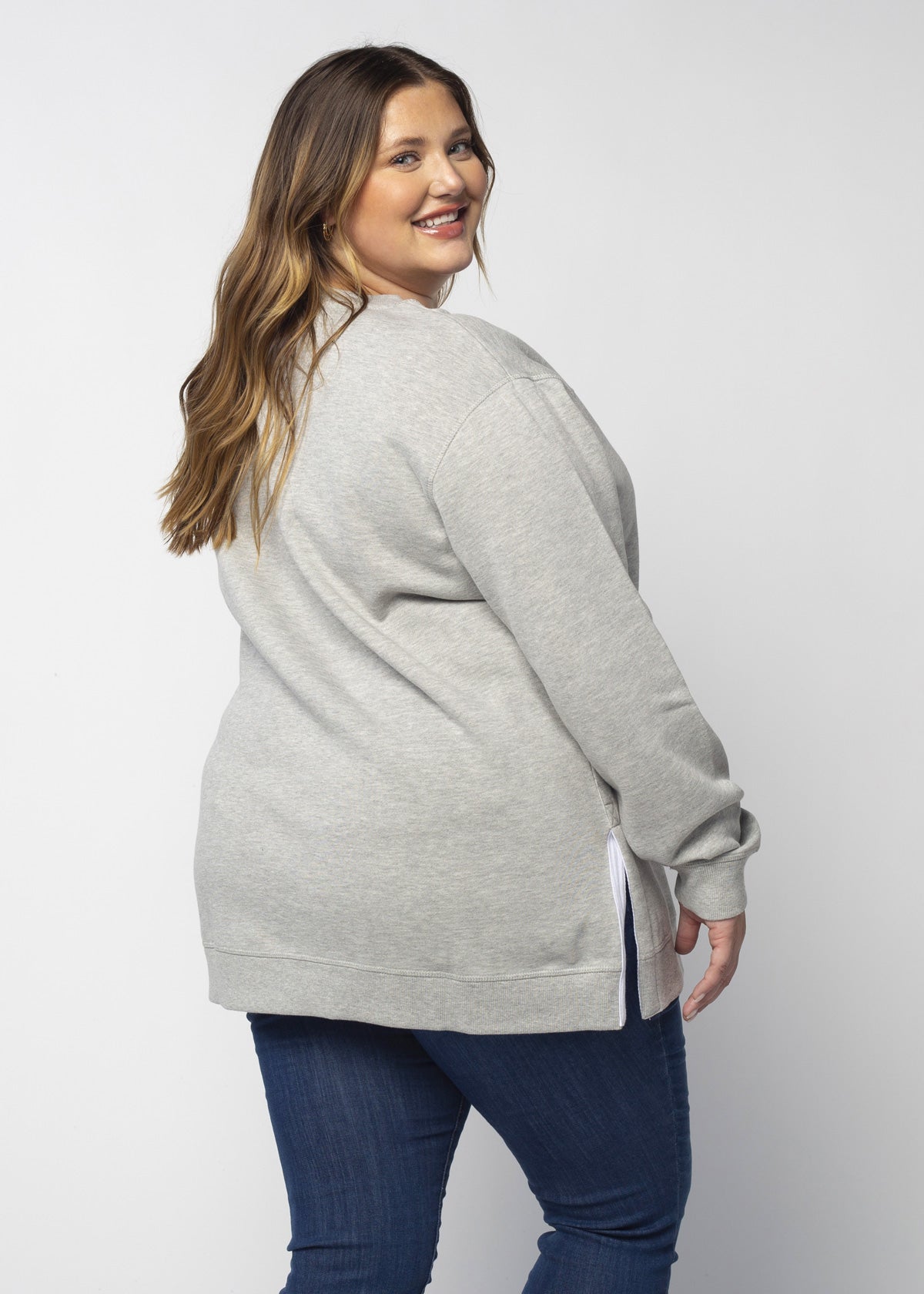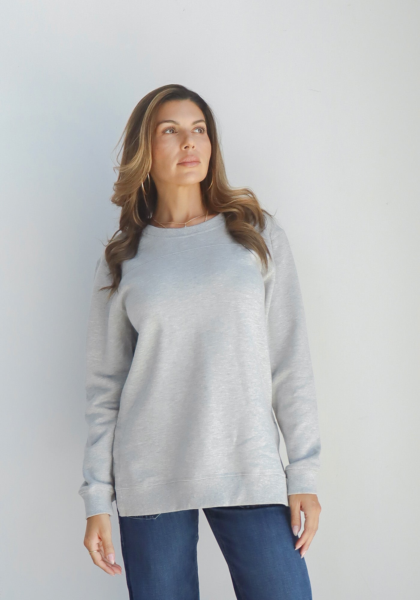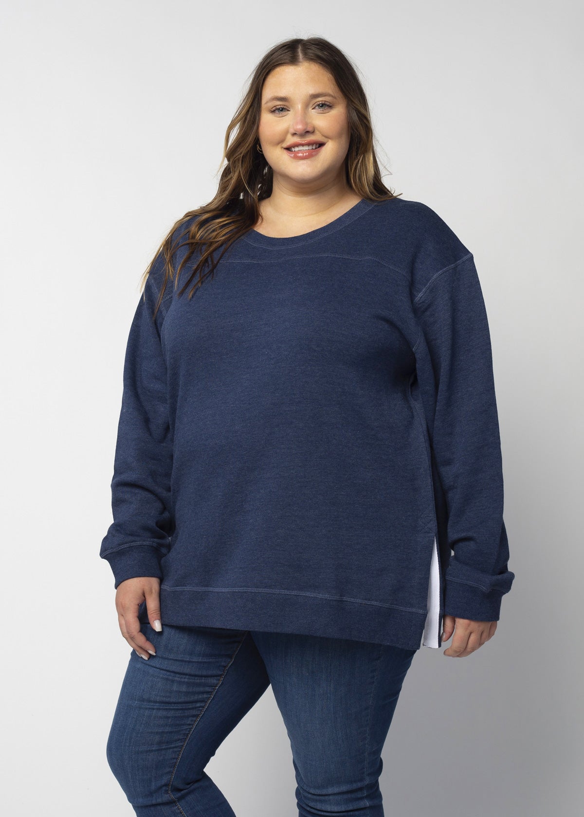 A classic crew neck fleece in a flattering tunic length that provides perfect coverage. Made for multitasking, the relaxed silhouette looks good in a variety of settings and pairs well with beloved jeans or leggings for extra comfort. Made from a heathered fleece with an extra smooth finish. Features easy-moving side slits finished with white twill tape