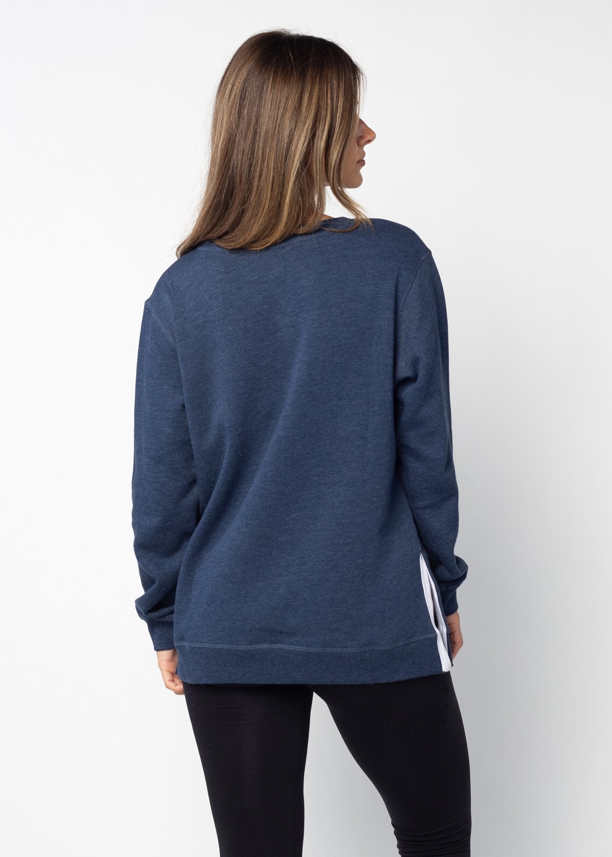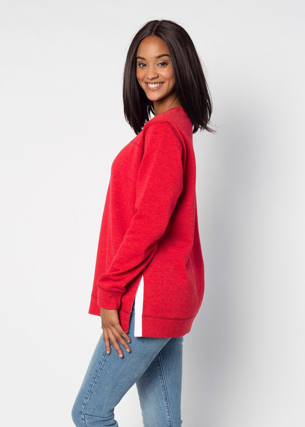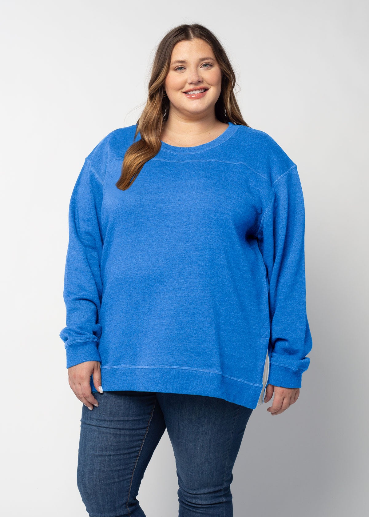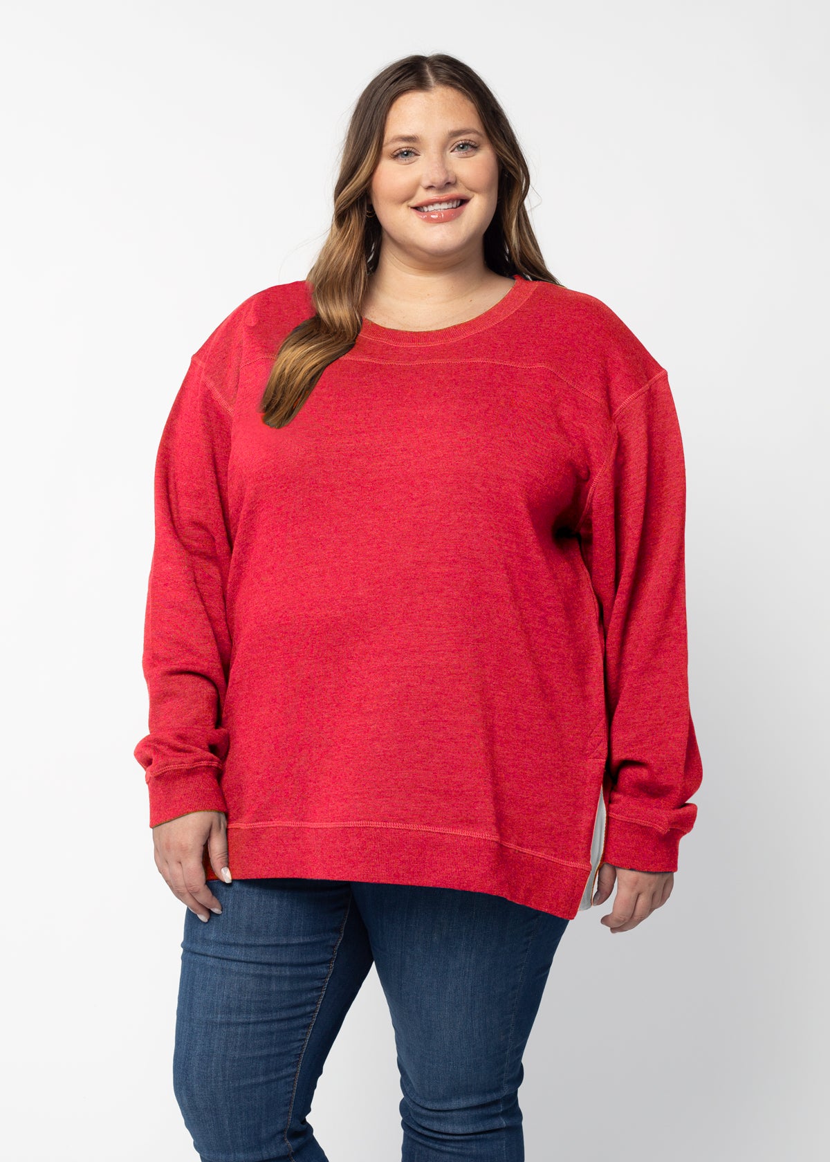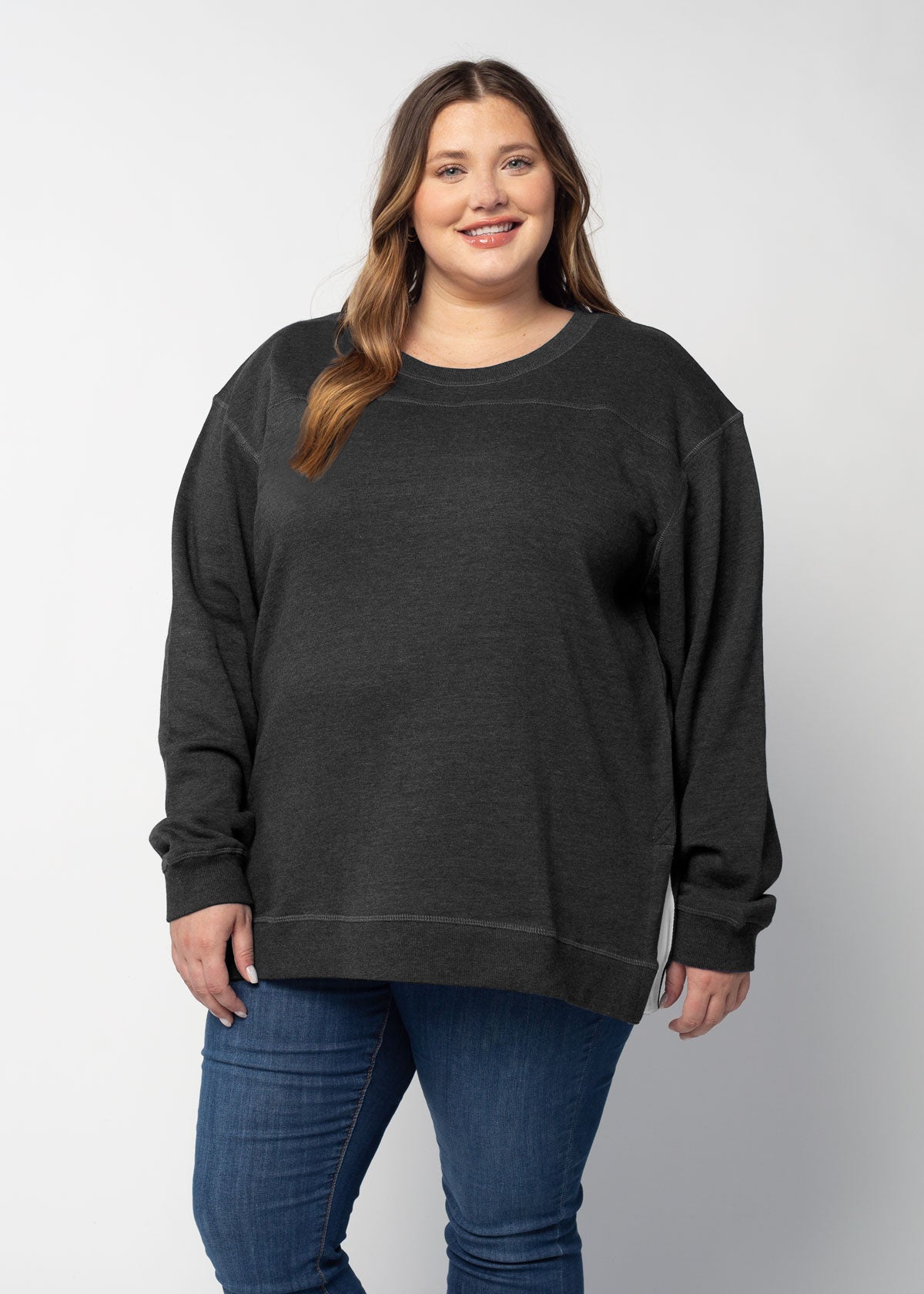 A classic crew neck fleece in a flattering tunic length that provides perfect coverage. Made for multitasking, the relaxed silhouette looks good in a variety of settings and pairs well with beloved jeans or leggings for extra comfort. Made from a heathered fleece with an extra smooth finish. Features easy-moving side slits finished with white twill tape