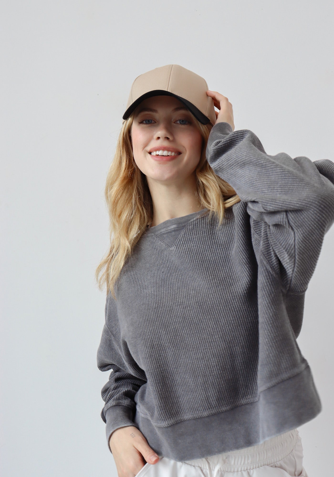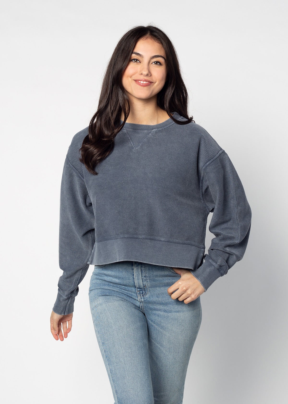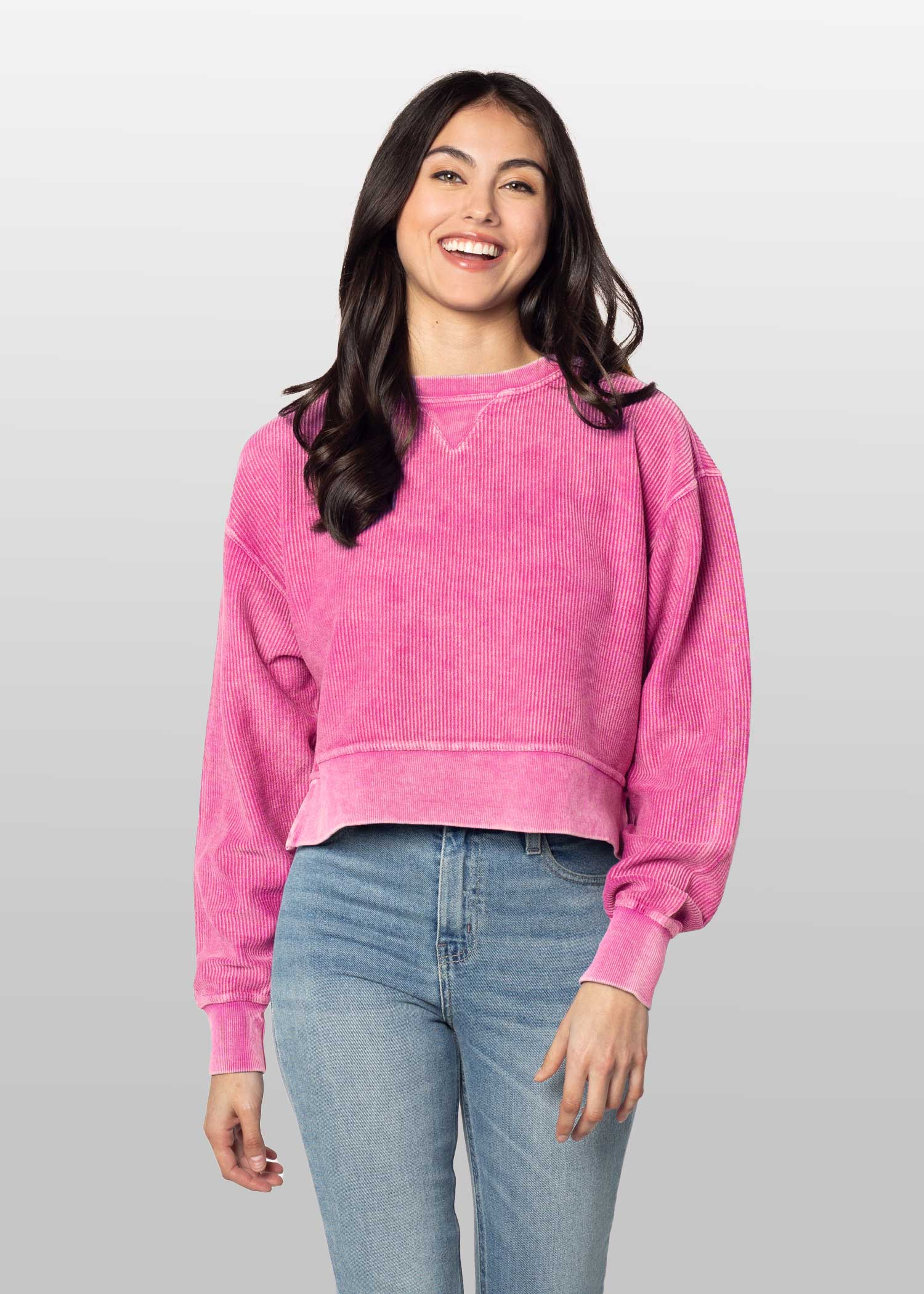 An update to our best seller! Oversized sweatshirt with a super soft vintage wash corded fabric. Waist-length, feminine silhouette features a ribbed neckline, cuff and hemline.