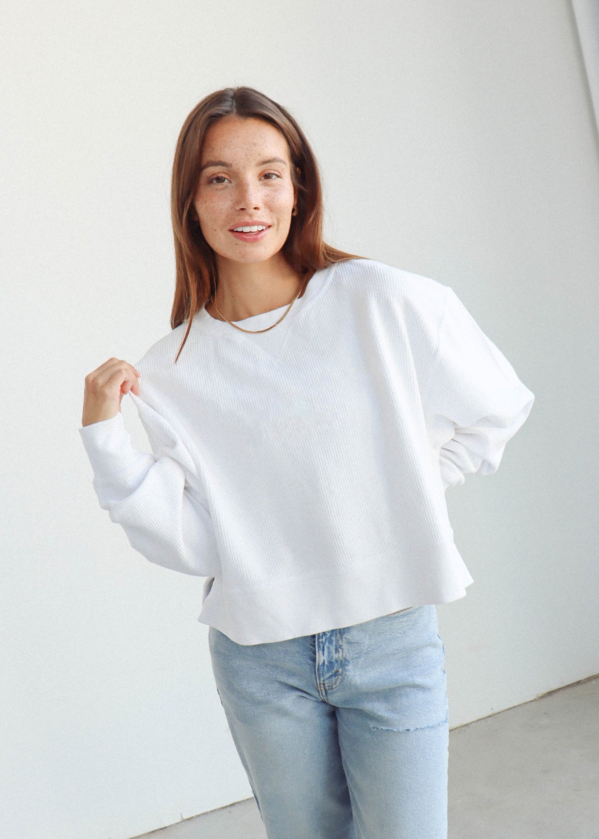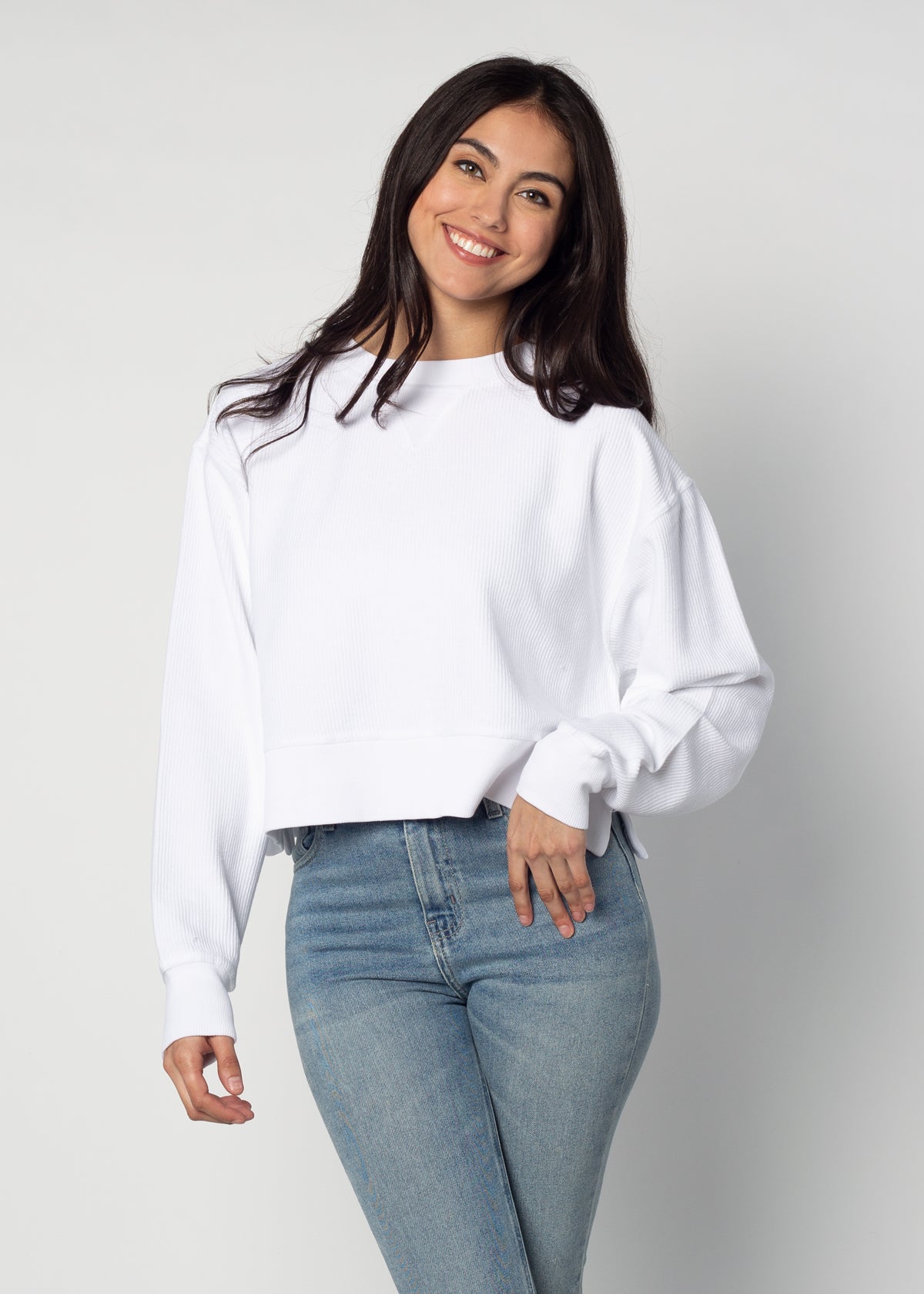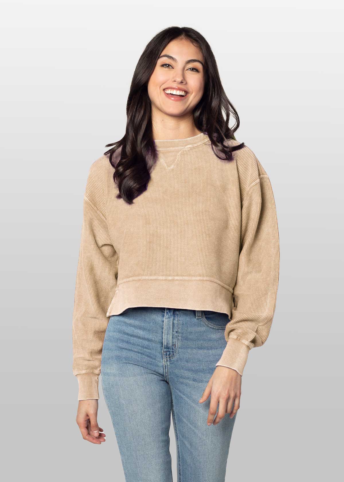 An update to our best seller! Oversized sweatshirt with a super soft vintage wash corded fabric. Waist-length, feminine silhouette features a ribbed neckline, cuff and hemline.