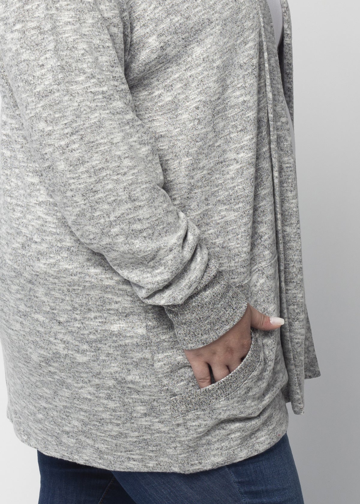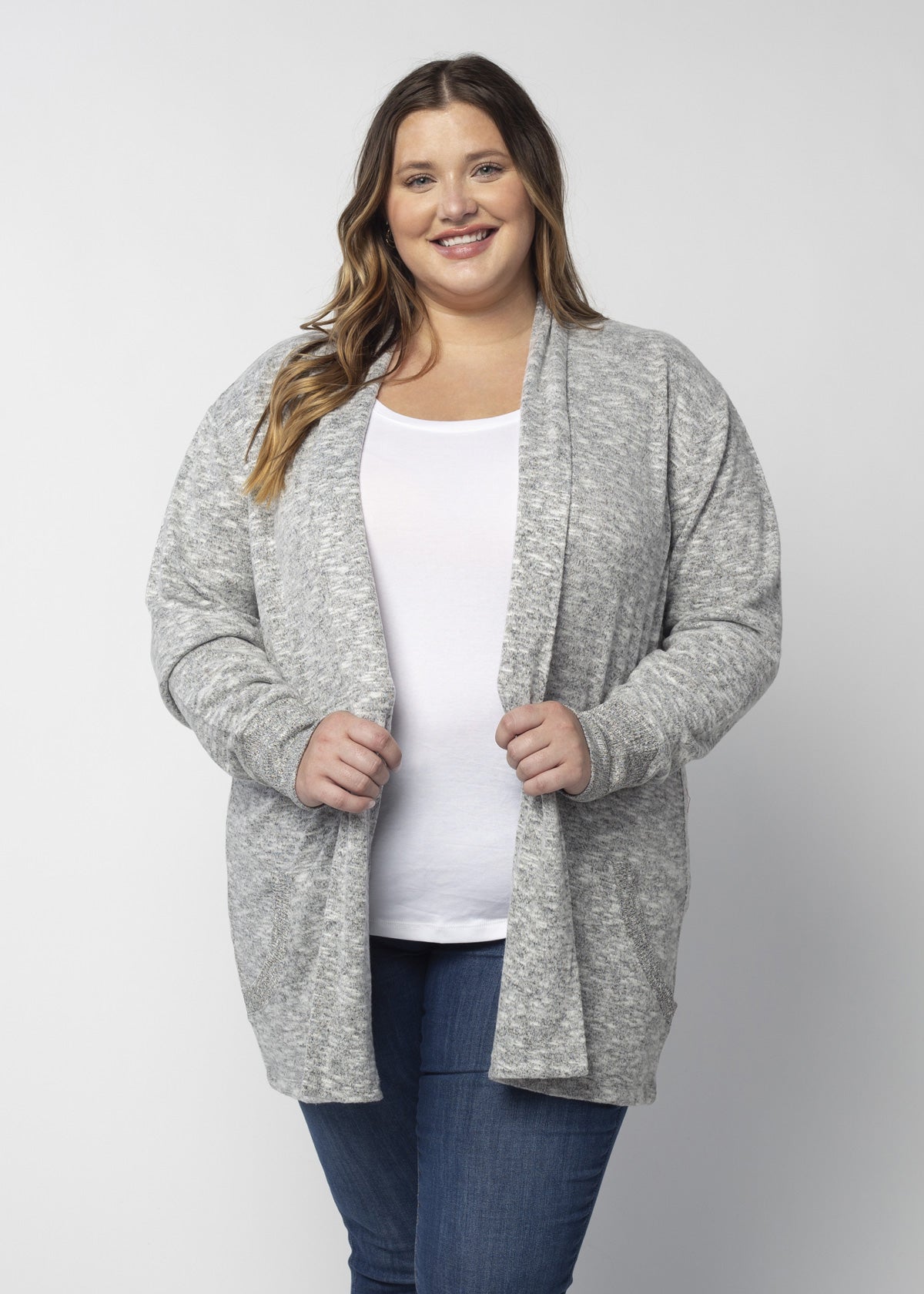 The perfect throw-on-and-go cardi for an easy, effortless look. Made of our softest fabric crafted from poly, viscose and spandex fibers. Features a gently draped, body-hugging fit, side pockets and rib at long sleeves.
