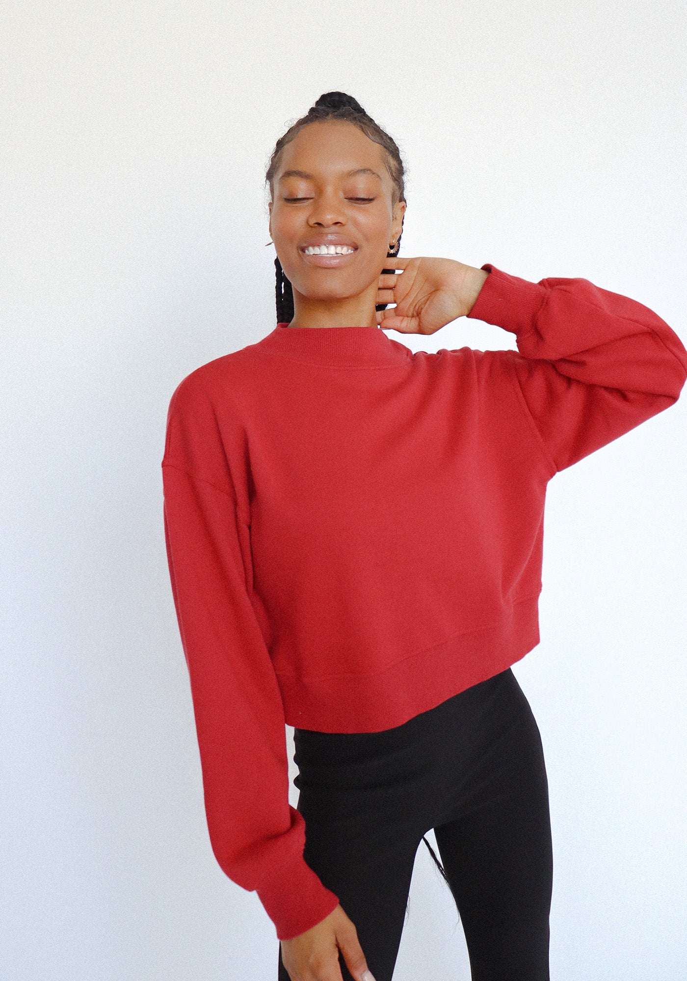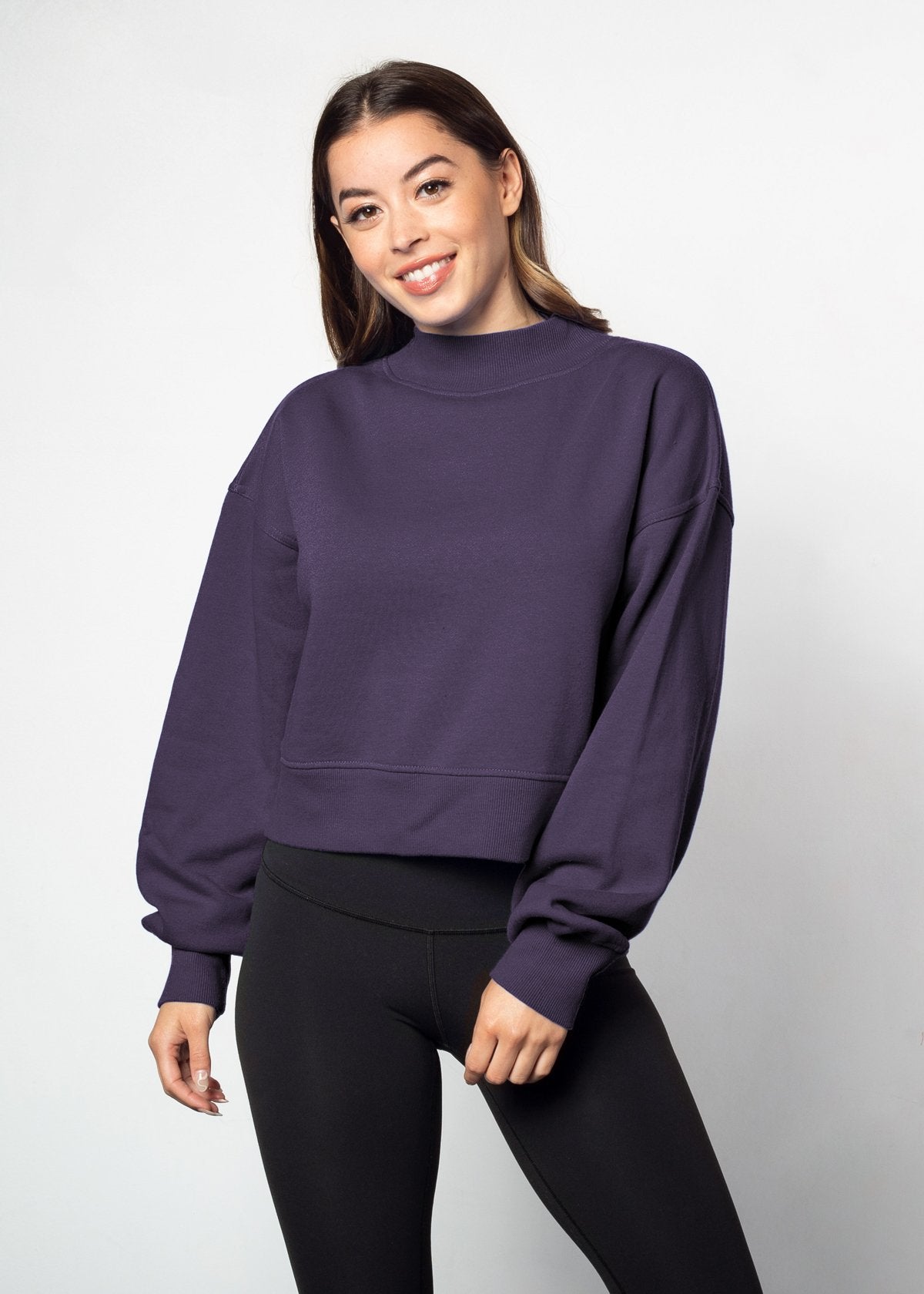 Stand out from the crowd with this on-trend mock neck waist-length sweatshirt. Drop shoulders, ribbed waistline and balloon sleeves. Made from an oh-so-soft fleece!