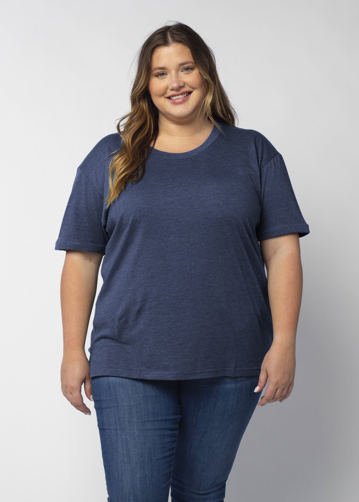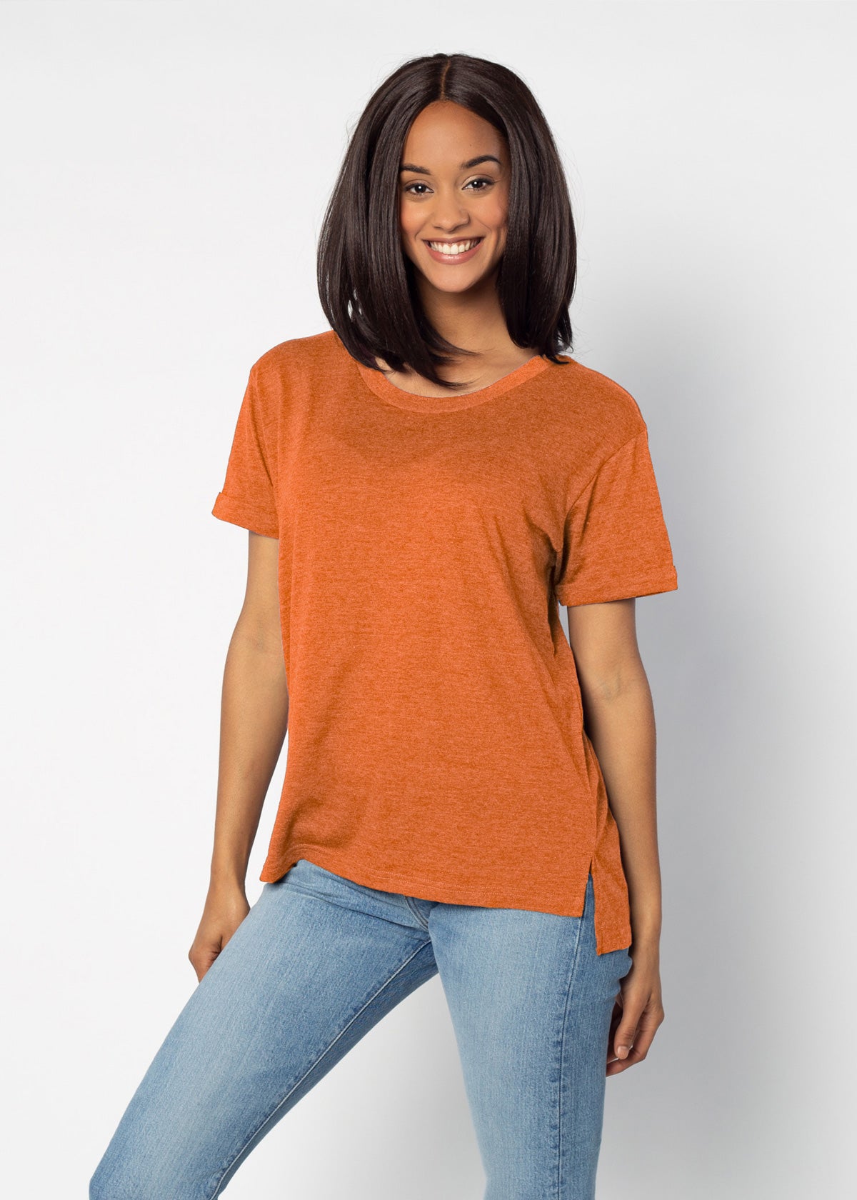 A closet staple with just the right amount of detail. This easygoing everyday tee is crafted from a lightweight cotton poly blend with a subtle heathered look and a soft hand feel. Features ribbed scoop neck, short rolled sleeves, and a longer back hem for extra coverage.