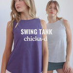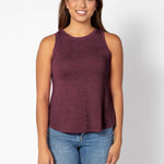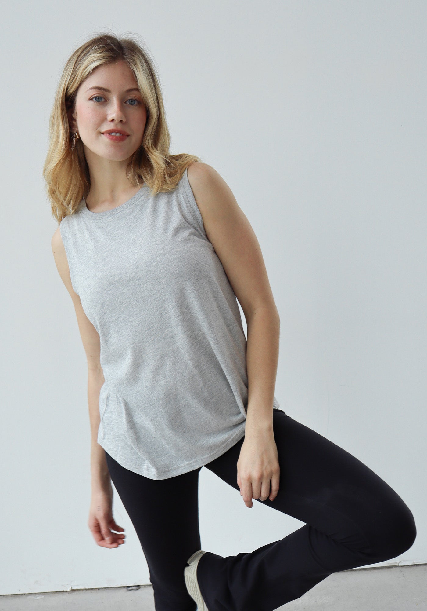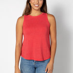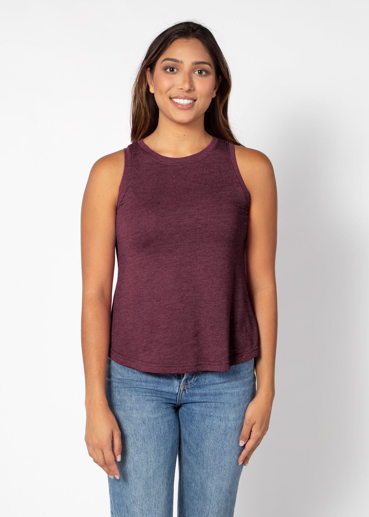 Crew neck tank with wide hemline and back seaming details. Just the right amount of coverage while keeping you cool on warm days. Made from a breathable cotton poly blend with a subtle heathered look and soft hand feel.
