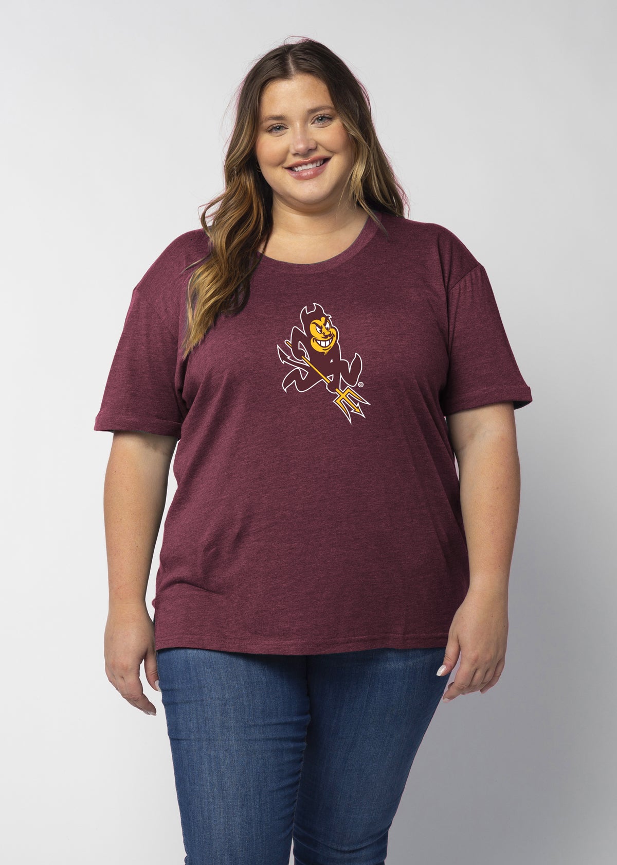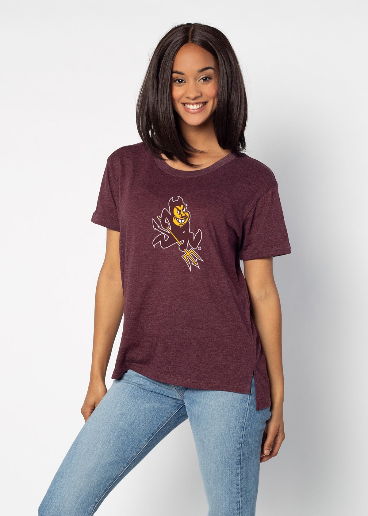 An Arizona State Sun Devils staple with just the right amount of detail. This easygoing everyday tee is crafted from a lightweight cotton poly blend with a subtle heathered look and a soft hand feel. Features ribbed scoop neck, short rolled sleeves, and a longer back hem for extra coverage.