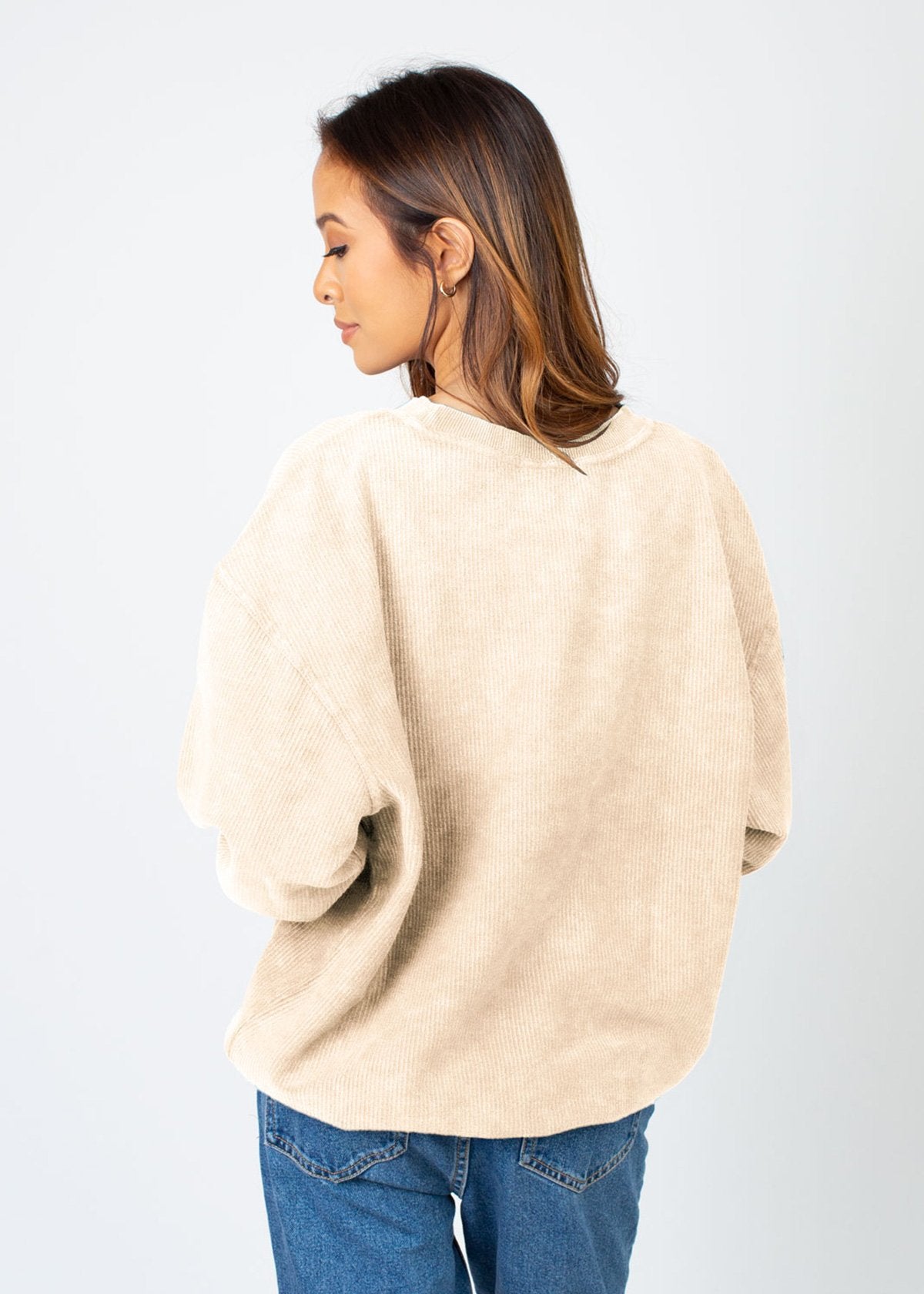There is no better way to show up for your team than by wearing our best-seller! The vintage wash on this corded fabric gives it our signature look. The Nebraska Cornhuskers Corded Crew in Natural features ribbed crew neckline, cuffs, and hemline and it has that oversized fit you love! It's an icon for a reason ;)