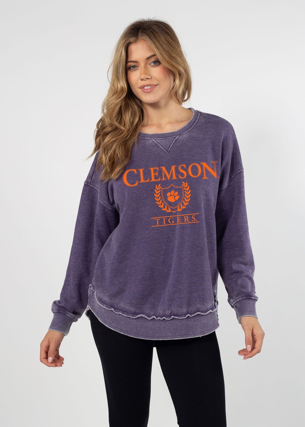 This ultra-soft Clemson Tigers crew neck with dropped shoulders and relaxed hi-lo curved bottom hemline features ribbed neckline, cuffs and hem. Our favorite worn look is achieved by the burnout wash process.