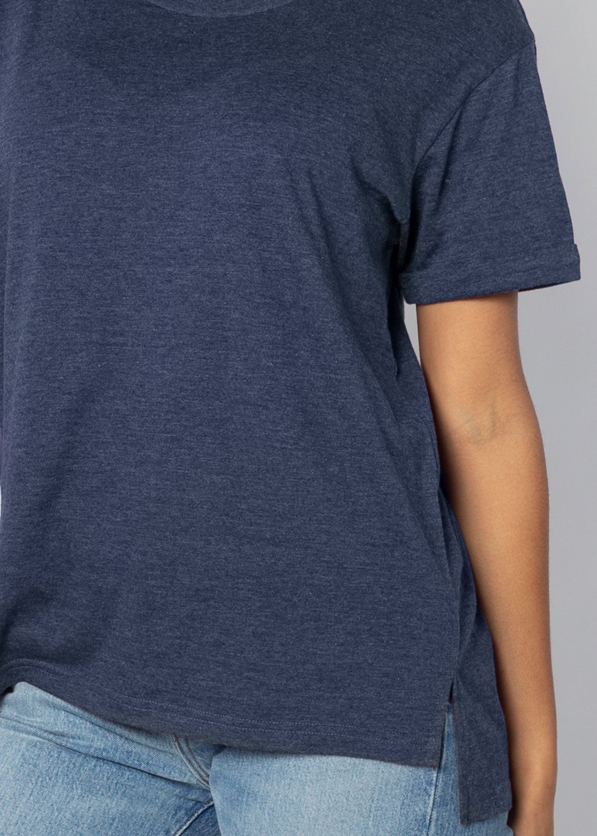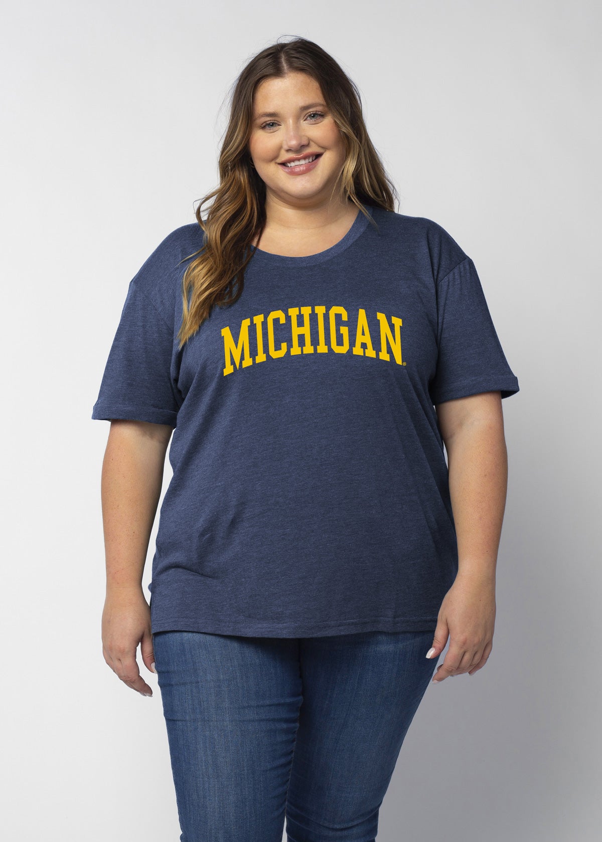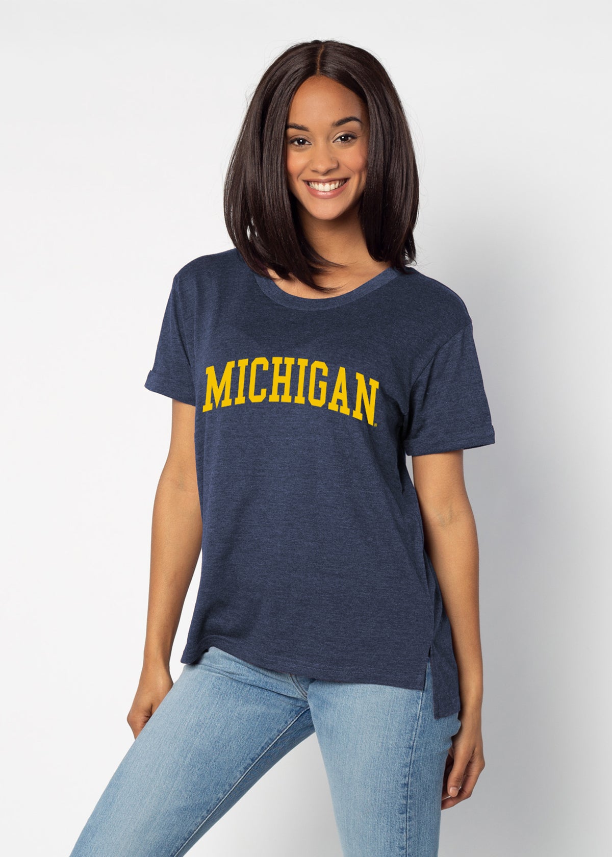 A Michigan Wolverines staple with just the right amount of detail. This easygoing everyday tee is crafted from a lightweight cotton poly blend with a subtle heathered look and a soft hand feel. Features ribbed scoop neck, short rolled sleeves, and a longer back hem for extra coverage.