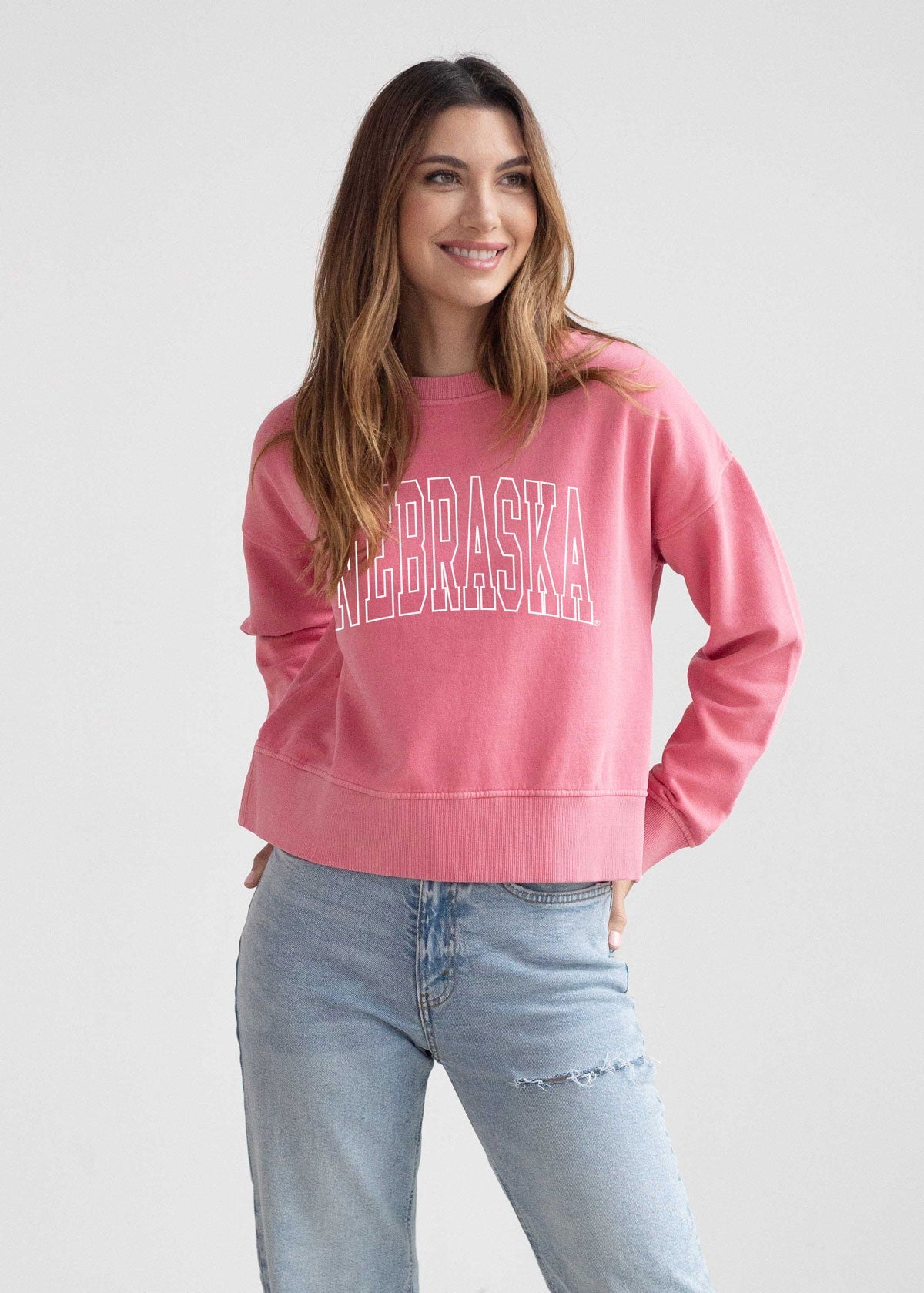 Introducing our Nebraska Cornhuskers Malibu Crew sweatshirt, crafted from our signature Salt Wash fleece, this pullover is as soft as it gets, offering a luxurious feel against your skin. Designed to elevate your everyday style. Featuring a cropped length and flattering seaming details, along with a classic crew neckline and wide bottom rib band.