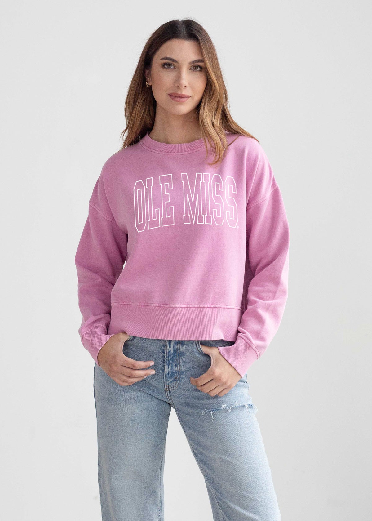 Meet the Ole Miss Rebels Fine Line Crewneck. Introducing our Malibu Crew sweatshirt, crafted from our signature Salt Wash fleece, this pullover is as soft as it gets, offering a luxurious feel against your skin. Designed to elevate your everyday style. Featuring a cropped length and flattering seaming details, along with a classic crew neckline and wide bottom rib band.
