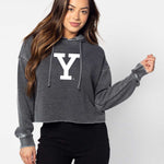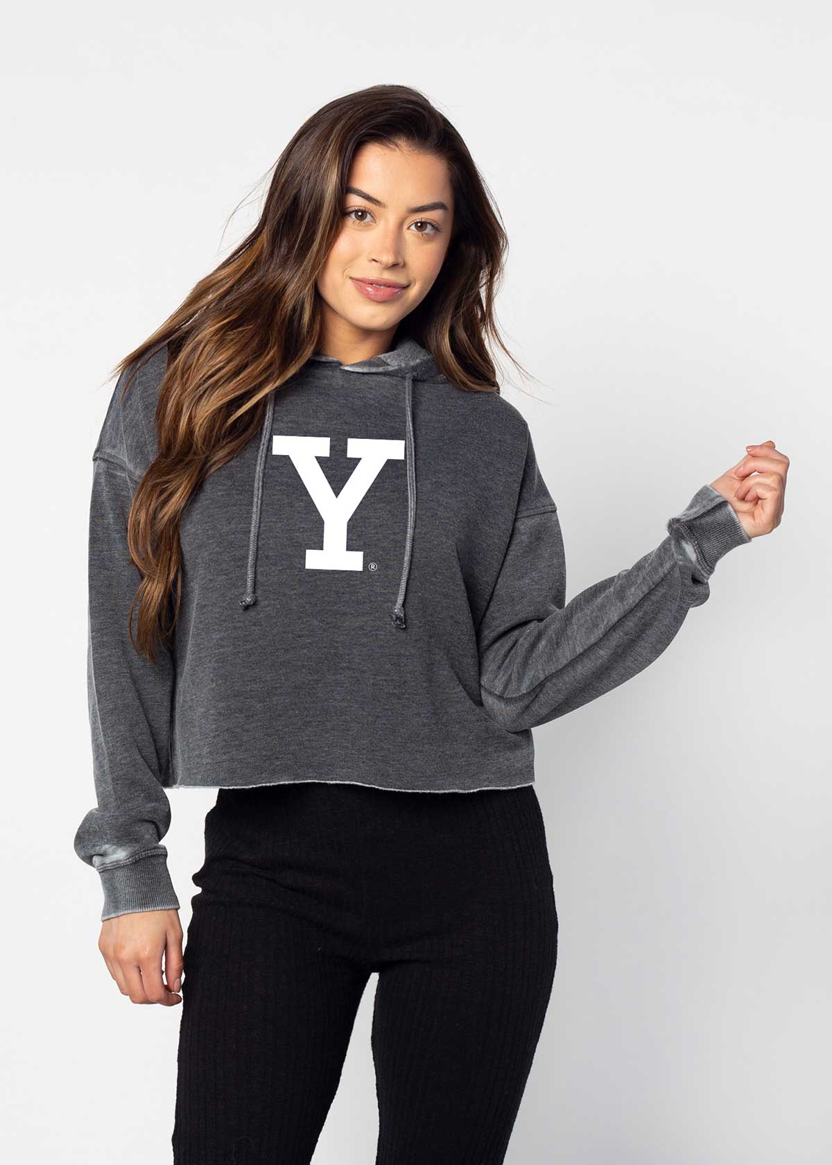 Meet the Yale Big Logo Mid-Length Hoodie. The softest hoodie you'll own! Roomy and boxy burnout fleece cropped hoodie. Features a drawstring hood, dropped shoulders, and raw edge hemline. Burnout wash process provides a unique, washed and worn look and a comfortable feel. Pairs perfectly with our burnout joggers for trendy matching set.