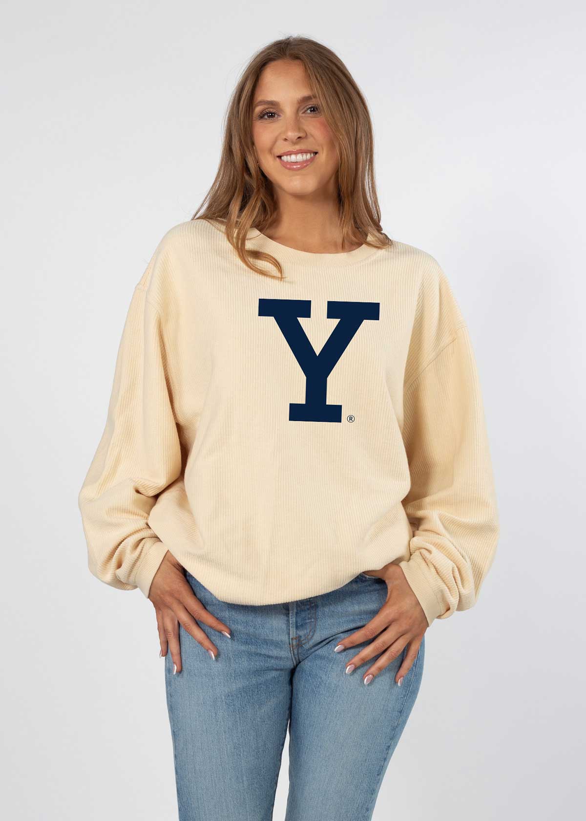 Meet the Yale Big Logo Original Corded Crew. Our best seller! Oversized sweatshirt with a super soft, vintage wash corded fabric. Features a ribbed crew neckline, cuffs, and hemline.