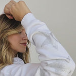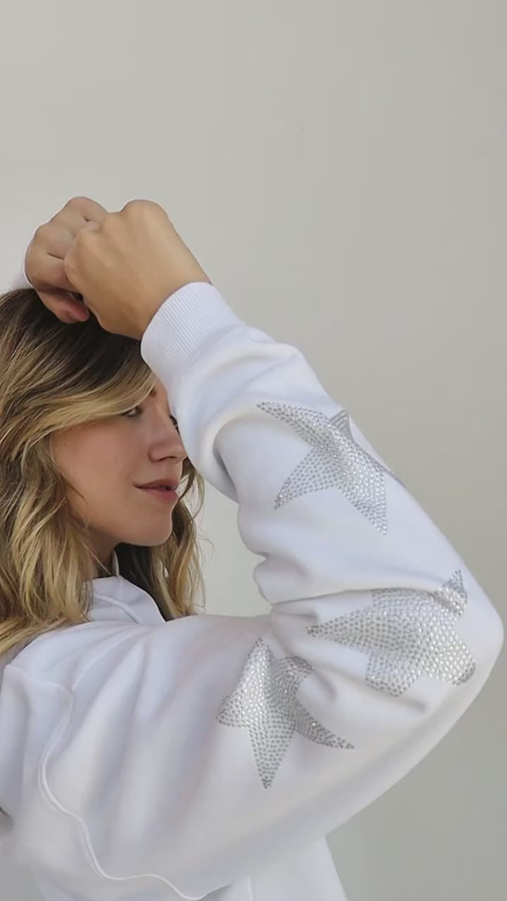 Our staple boyfriend hoodie meets 90s glam. The Everybody Hoodie now has rhinestone stars on the sleeves. It features a kangaroo front pocket, ribbed cuffs, a hem, and dropped shoulders. The burnout wash process provides a unique worn-out look and a comfortable feel.