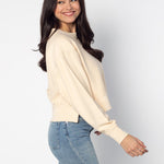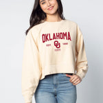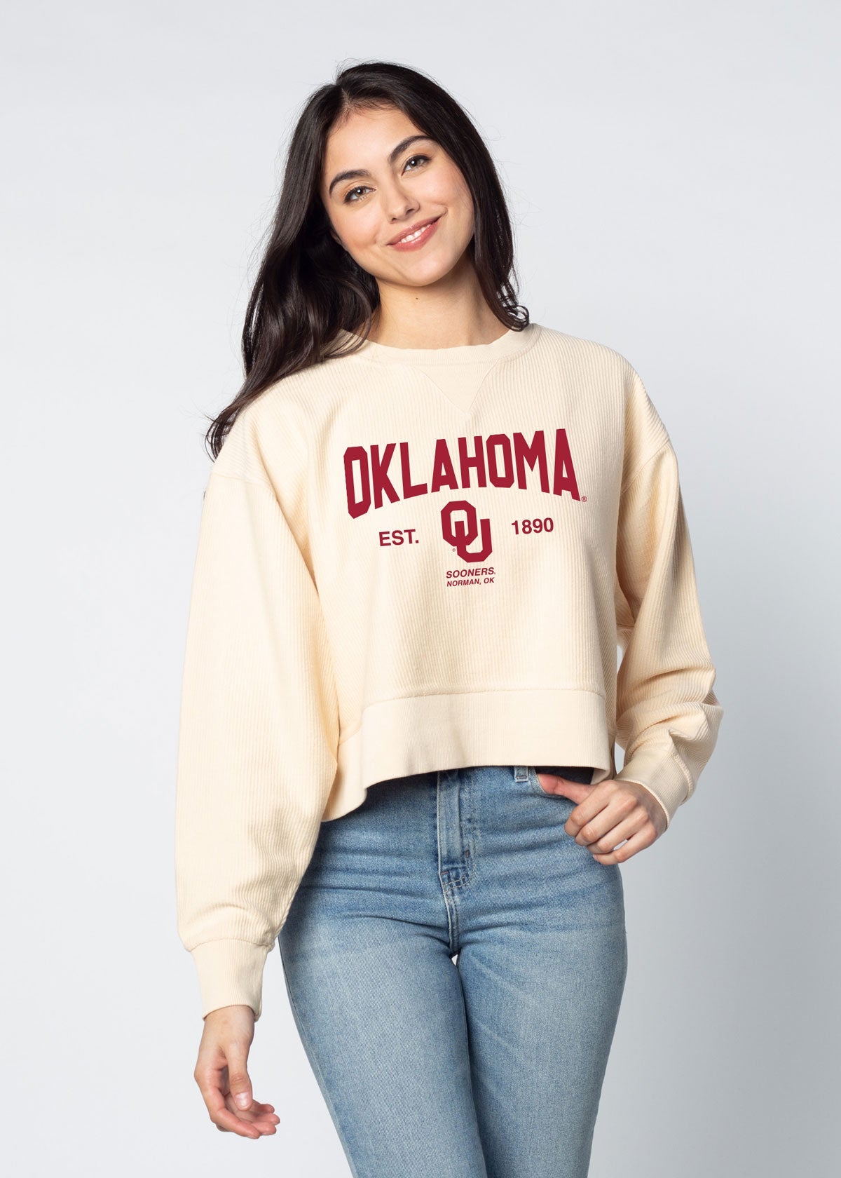 An update to our best seller! Oklahoma Sooners oversized sweatshirt with a super soft vintage wash corded fabric. Shorter cropped, feminine silhouette features a ribbed neckline, cuff and hemline.