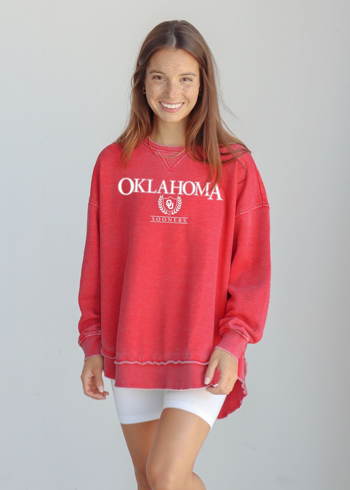 This ultra-soft Oklahoma Sooners crew neck with dropped shoulders and relaxed hi-lo curved bottom hemline features ribbed neckline, cuffs and hem. Our favorite worn look is achieved by the burnout wash process.