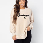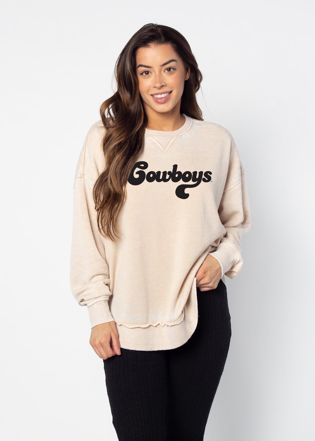This ultra-soft Oklahoma State Cowboys crew neck with dropped shoulders and relaxed hi-lo curved bottom hemline features ribbed neckline, cuffs and hem. Our favorite worn look is achieved by the burnout wash process.
