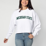 An update to our best seller! Michigan State Spartans oversized sweatshirt with a super soft vintage wash corded fabric. Shorter cropped, feminine silhouette features a ribbed neckline, cuff and hemline.