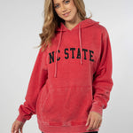 Unisex North Carolina State Wolfpack fleece hoodie with kangaroo front pocket. Ribbed cuffs and hem. Dropped shoulders and relaxed bottom hemline. Burnout wash process provides a unique, washed and worn look and a comfortable feel.